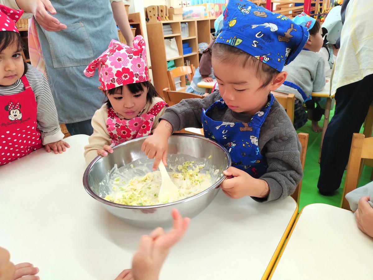 今日は身体測定の後、園庭で遊びました。葉っぱおばけを保育士に作ってもらい大喜びのあか組さん。葉っぱをたくさん拾ってきて「次はこの葉っぱで作って〜!」「いっぱい作って〜!」と盛り上がっていました。午後はクッキングでした。自分たちで具材を入れ、混ぜてお好み焼きを作りました。