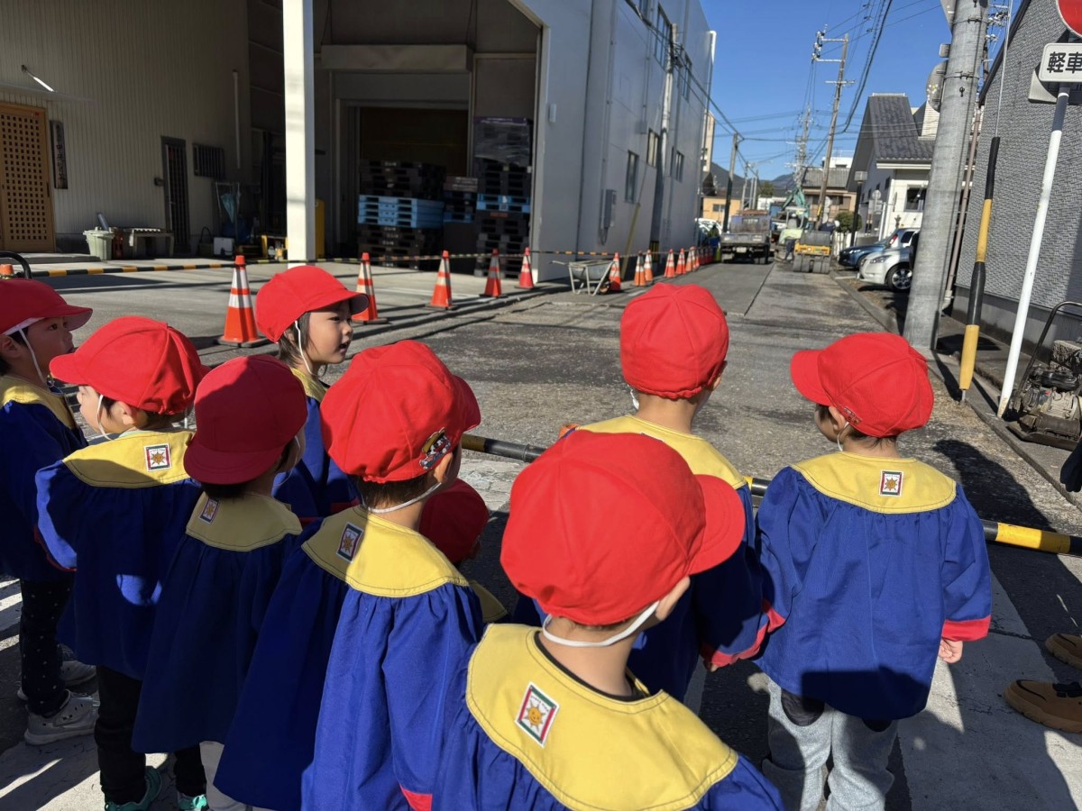 今日は園周辺をお散歩した後に園庭で遊びました。お散歩ではバスやダンプカー、ミキサー車をみることができ嬉しそうでした。進んでいくといつも通る道が工事中だったので少しだけ工事の様子を見学させてもらえました。ショベルカーやロードローラーが動いているところを見る事ができて大喜びのあか組さん!!帰り道も「かっこよかったぁ」とお話ししながら帰ってきました♪午後のおやつの後はミュージックパットや階段マットで遊びました!