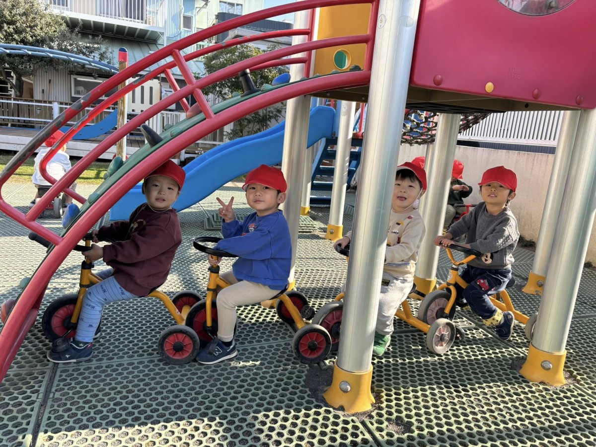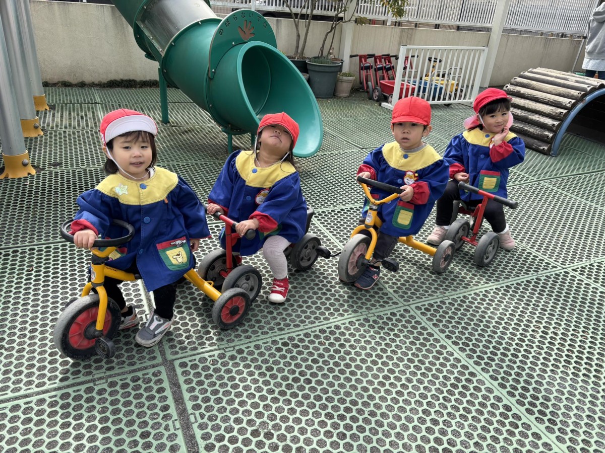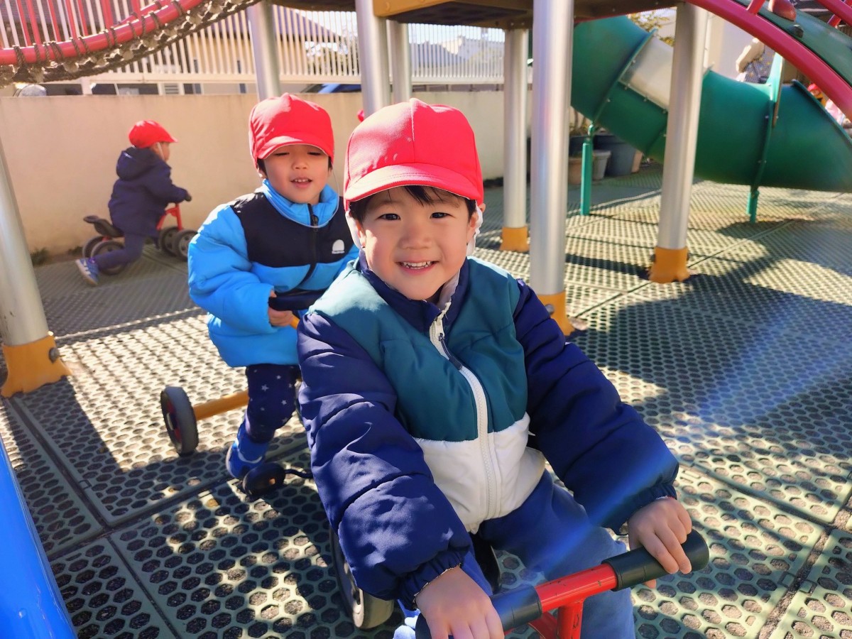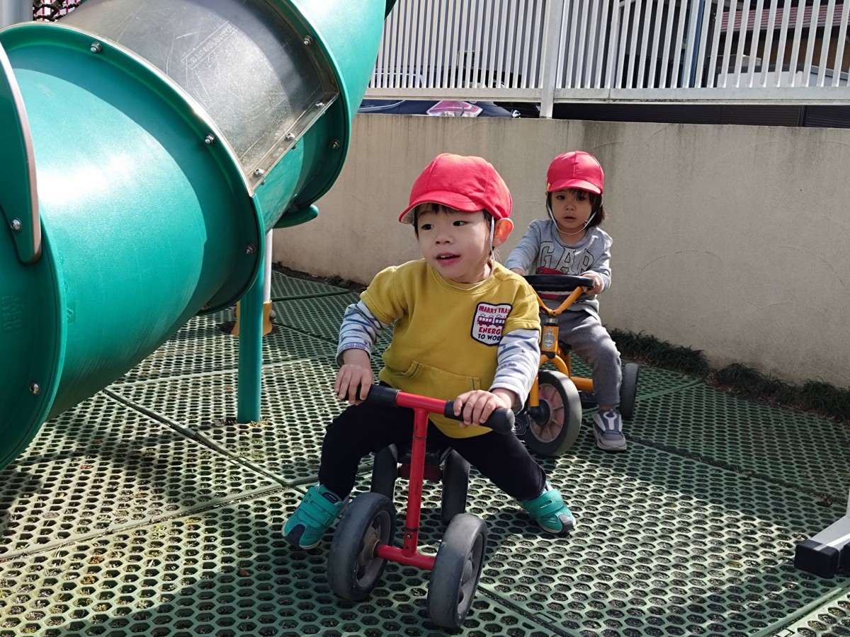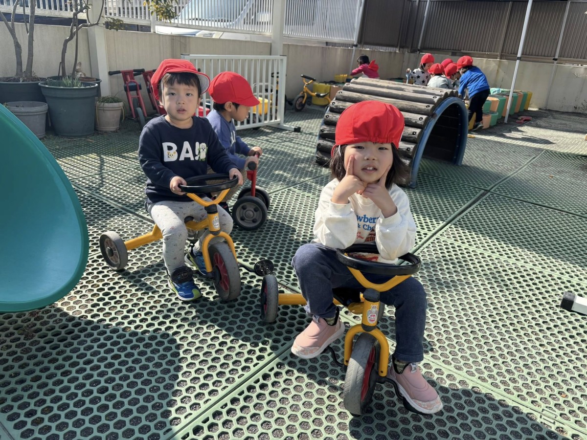 今日は園庭で遊びました。寒い一日でしたが元気いっぱいのあか組さん。三輪車や四輪車に乗り、園庭を駆け回ったり、遊具の下に隠れたりして楽しんでいました。三輪車を貸してほしそうなお友達がいることに気が付き、「貸してあげる」と声をかける優しい姿も見られました。