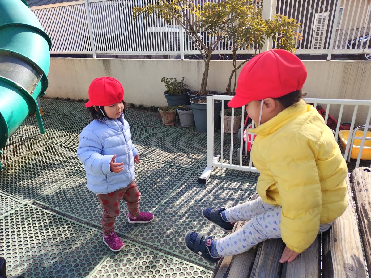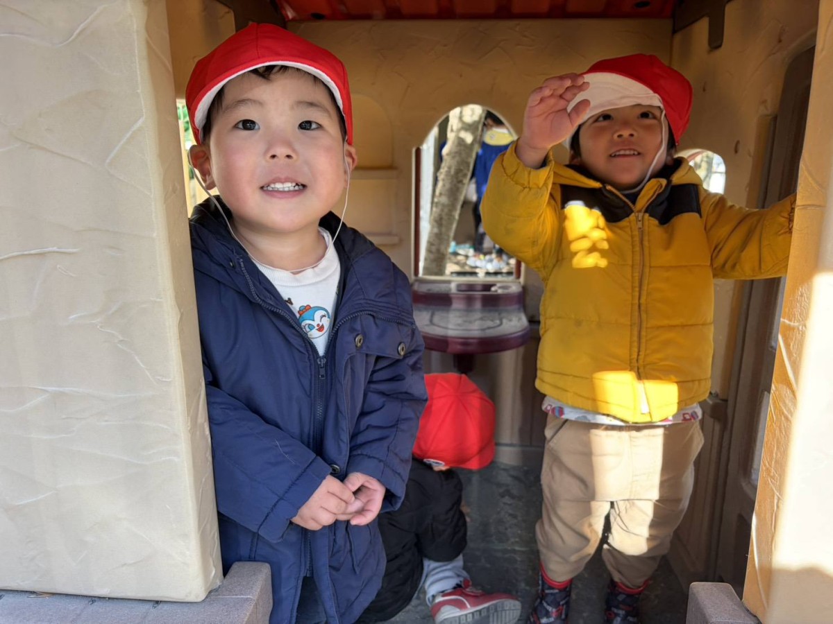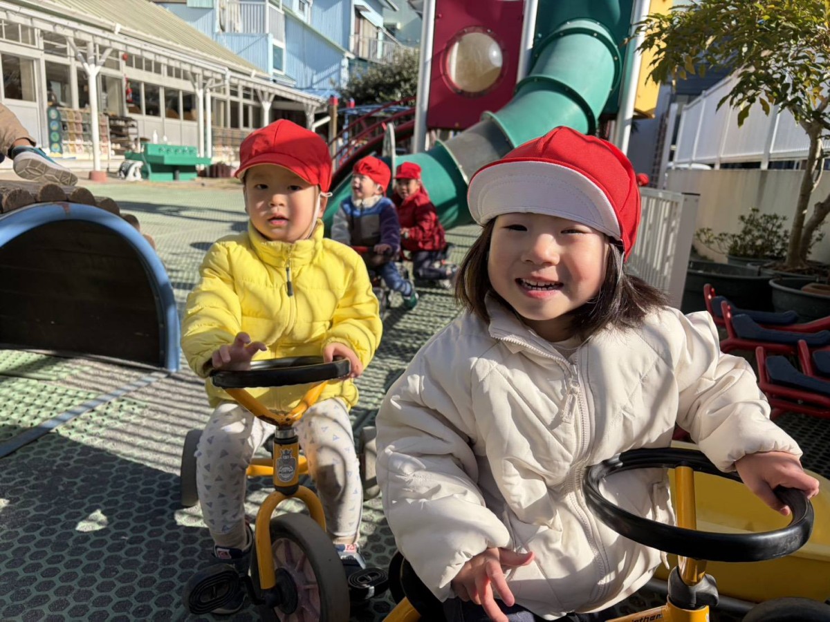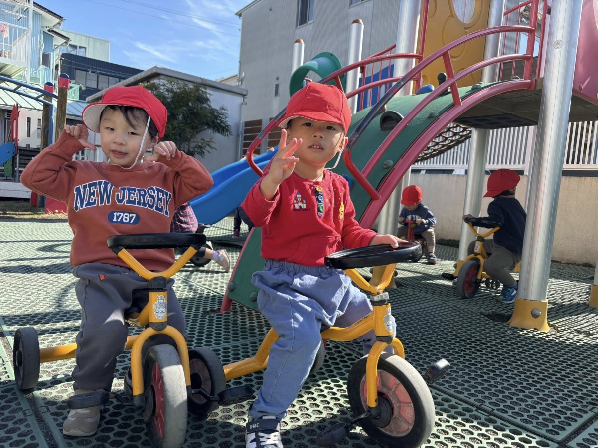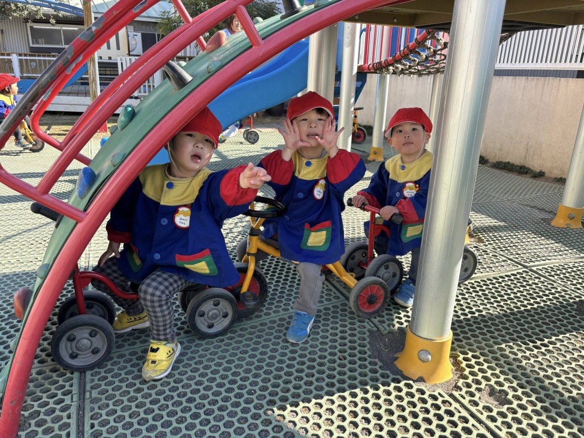 今日は園庭で遊びました。寒い一日でしたが元気いっぱいのあか組さん。三輪車や四輪車に乗り、園庭を駆け回ったり、遊具の下に隠れたりして楽しんでいました。三輪車を貸してほしそうなお友達がいることに気が付き、「貸してあげる」と声をかける優しい姿も見られました。