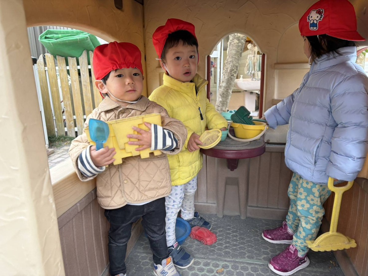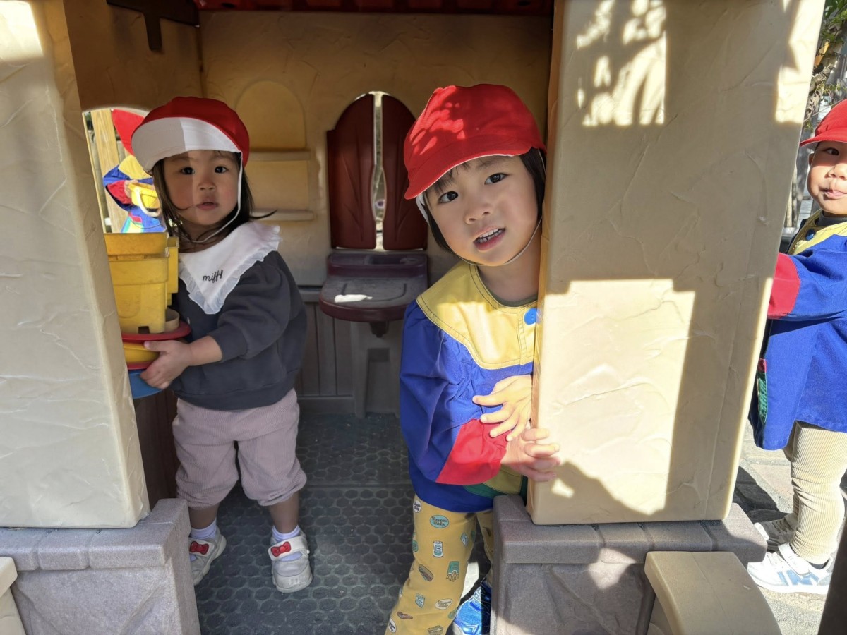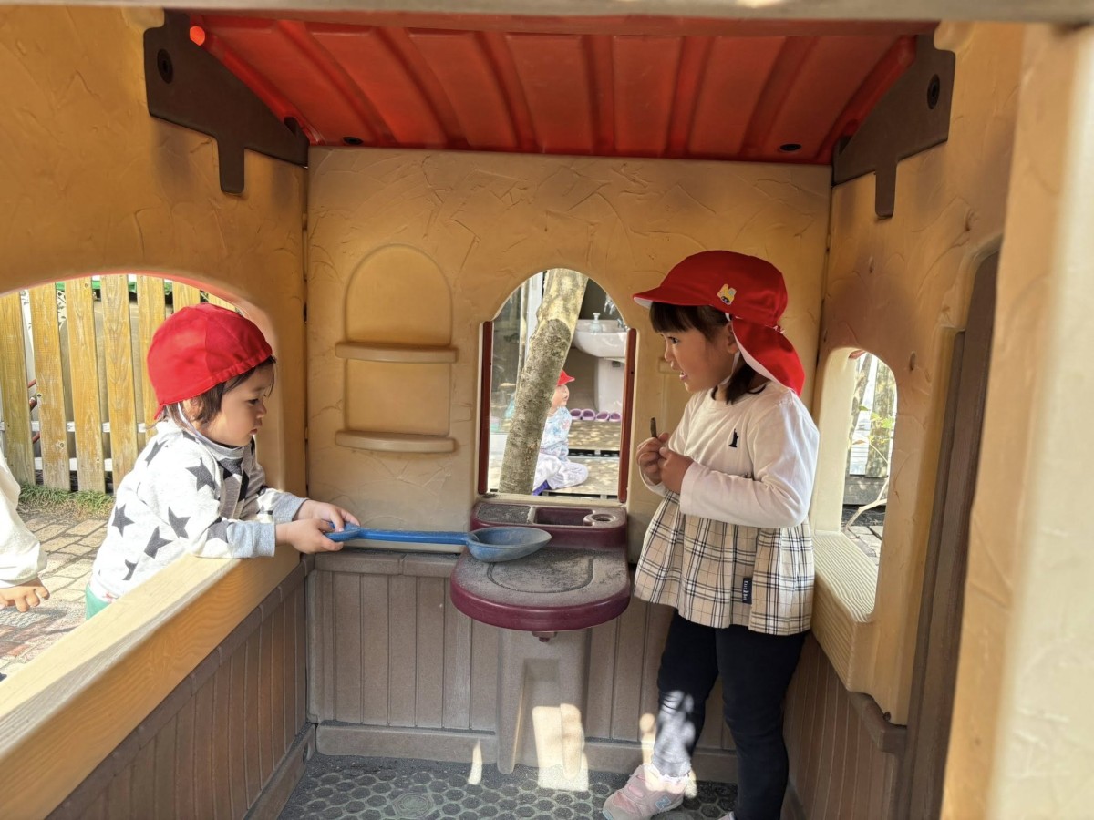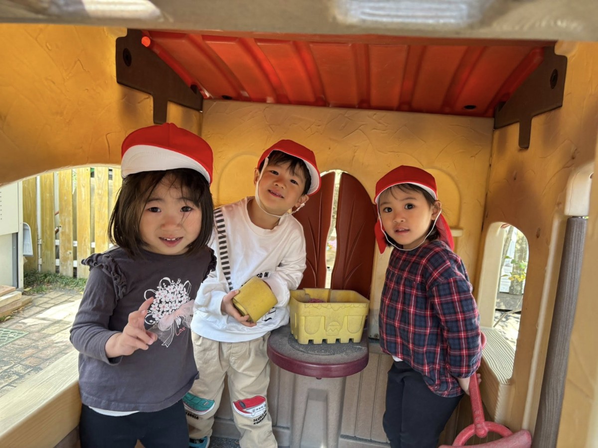今日は月刊誌を見た後にたっぷり園庭で遊びました。園庭ではお砂場でお友だちと一緒に大きなお山を作ったり、スモールハウスの中でごっこ遊びをしたり、バイクや三輪車でドライブを楽しんだりとお友だちとの時間を楽しく過ごしていました♪