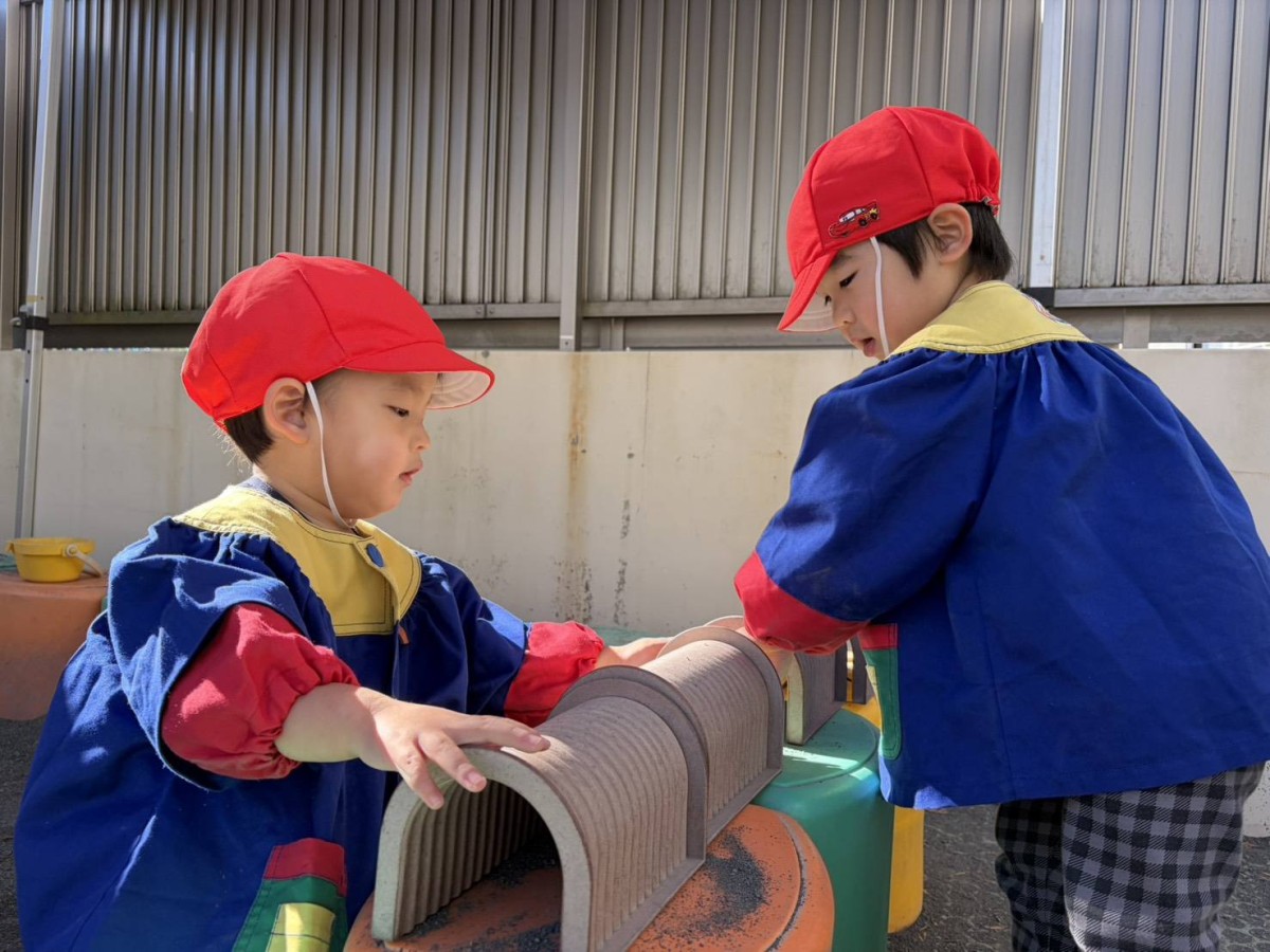 今日は園庭で遊びました。砂場でトンネルを並べて遊ぶお友達。新幹線や車のおもちゃを片手にトンネルを潜り抜けさせる遊びを楽しんでいました。三輪車や四輪車で遊ぶのが好きな子は、縦に並んで「新幹線みたい〜」と笑い合う姿が見られました。