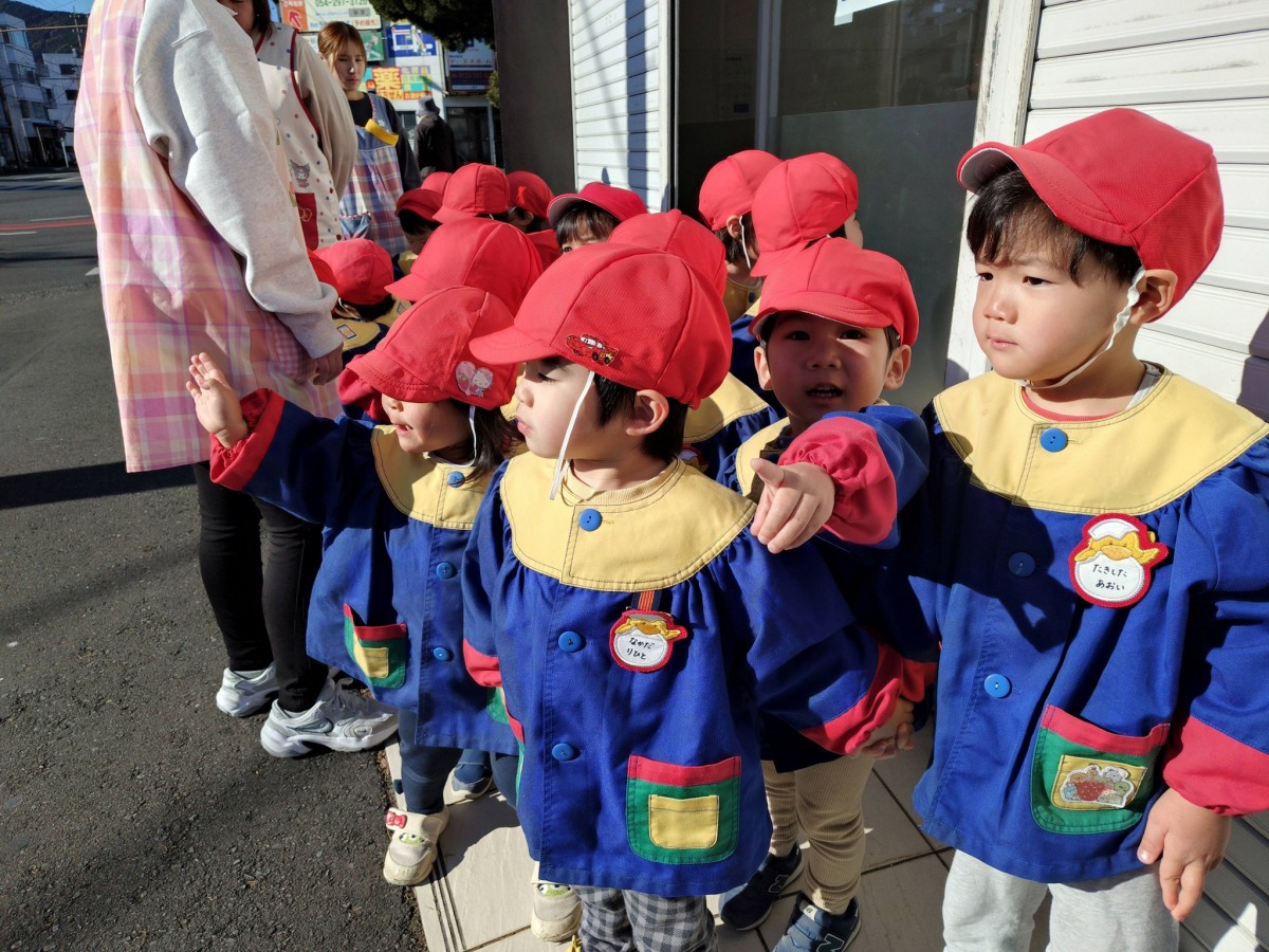 | 今日は2グループに分かれてお友達と手を繋いで園周辺のお散歩にいきました。少しずつ慣れてきたのか以前に比べ歩き方が上手になってきたように感じられます。道中、バスやダンプトラックを見て「バスきたよ!」「ダンプトラックだー!」と嬉しそうにする子や、犬を見かけて「おーい!」と手を振る姿が見られました。お散歩のあとは園庭で遊び、午後はクリスマスの製作をしました。 |