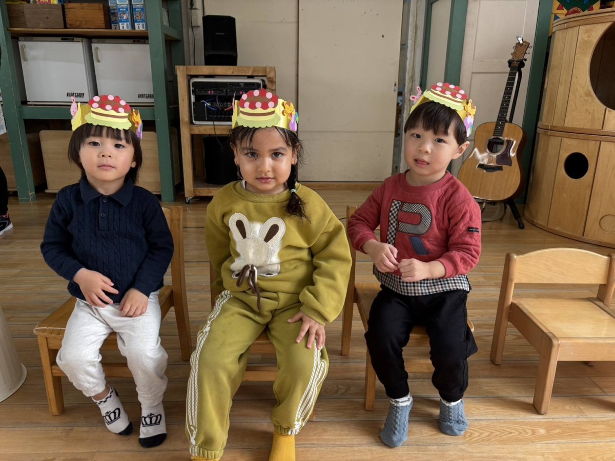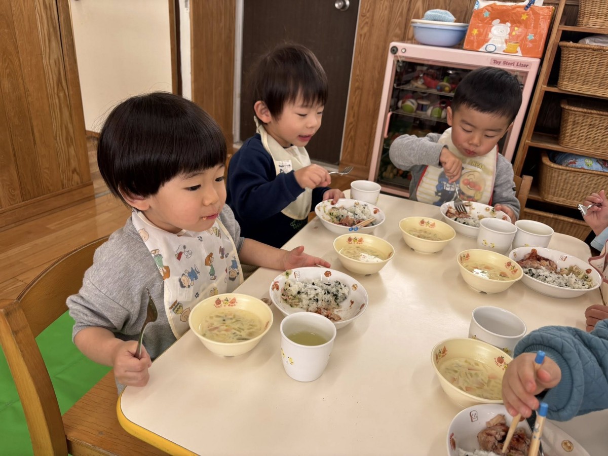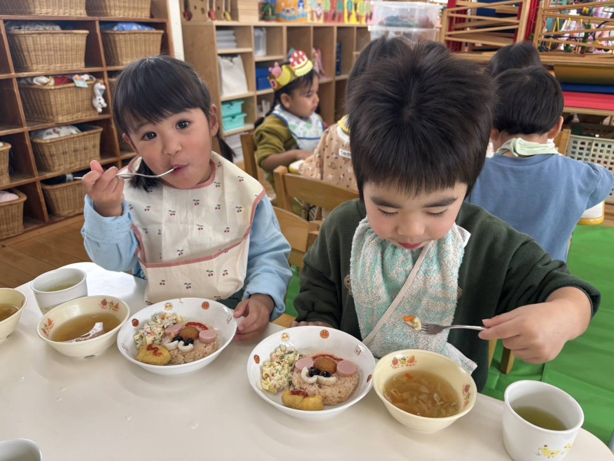 今日は1月のお誕生会がありました。あか組さんからは3人のお友達がお祝いをしてもらいました。給食はみんなが大好きなアンパンマンのご飯。「アンパンマンだ〜!」とうれしそうな声をあげながらパクパクと食べていました。