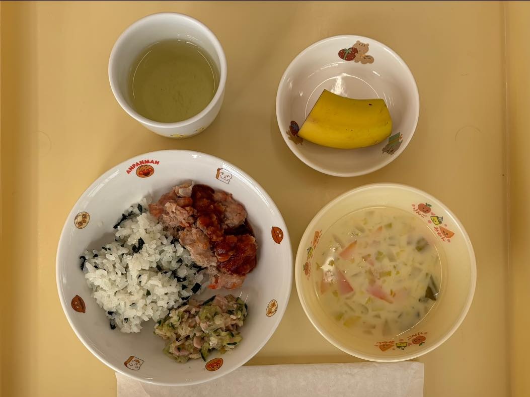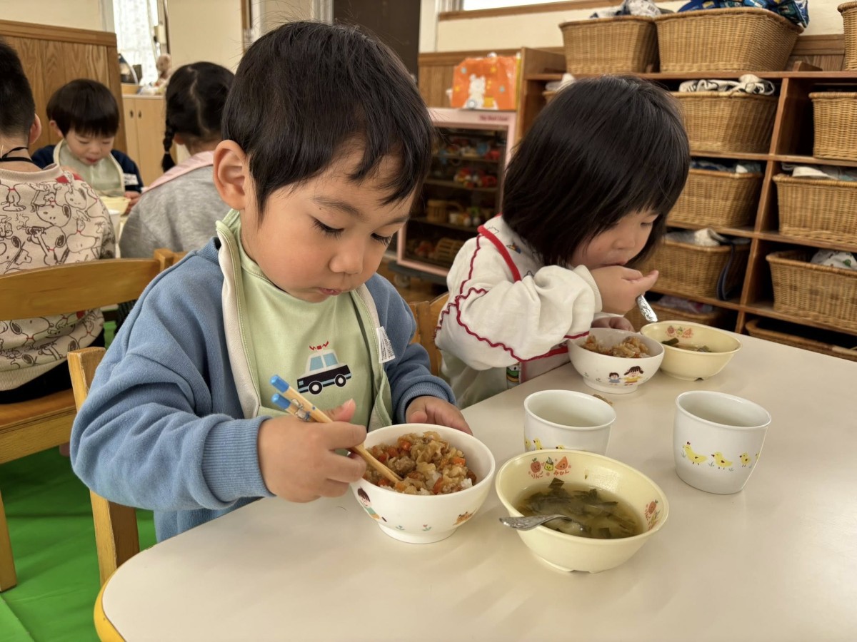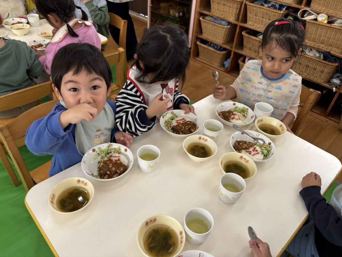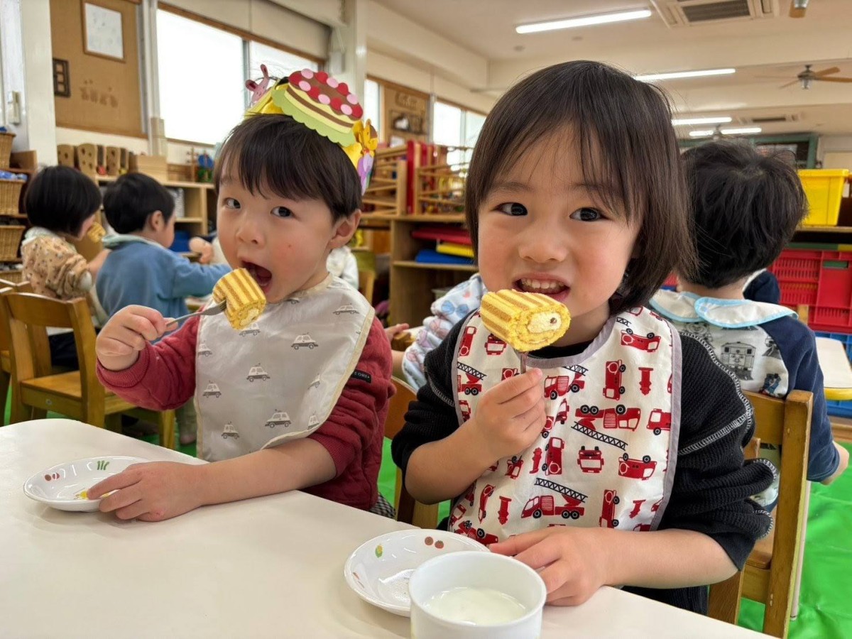 今日は1月のお誕生会がありました。あか組さんからは3人のお友達がお祝いをしてもらいました。給食はみんなが大好きなアンパンマンのご飯。「アンパンマンだ〜!」とうれしそうな声をあげながらパクパクと食べていました。
