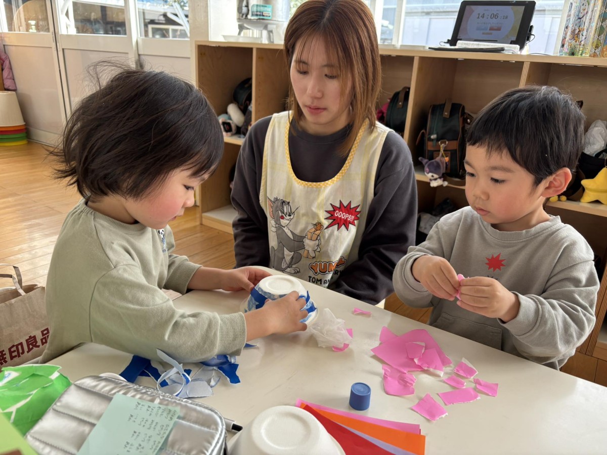 今日は月刊誌を見た後に園庭で遊びました。園庭ではデッキの滑り台を何回も滑って楽しんだり、バイクや三輪車をお友だちと上手に貸し借りしながら楽しんだりしていました。最後に大型遊具の青い滑り台に挑戦すると「楽しかった」「またやりたい」と嬉しそうなあか組さんでした♪ 午後のおやつの後はオニのお面作りで好きな色の折り紙を選んで千切りカップに貼り付けをしました!