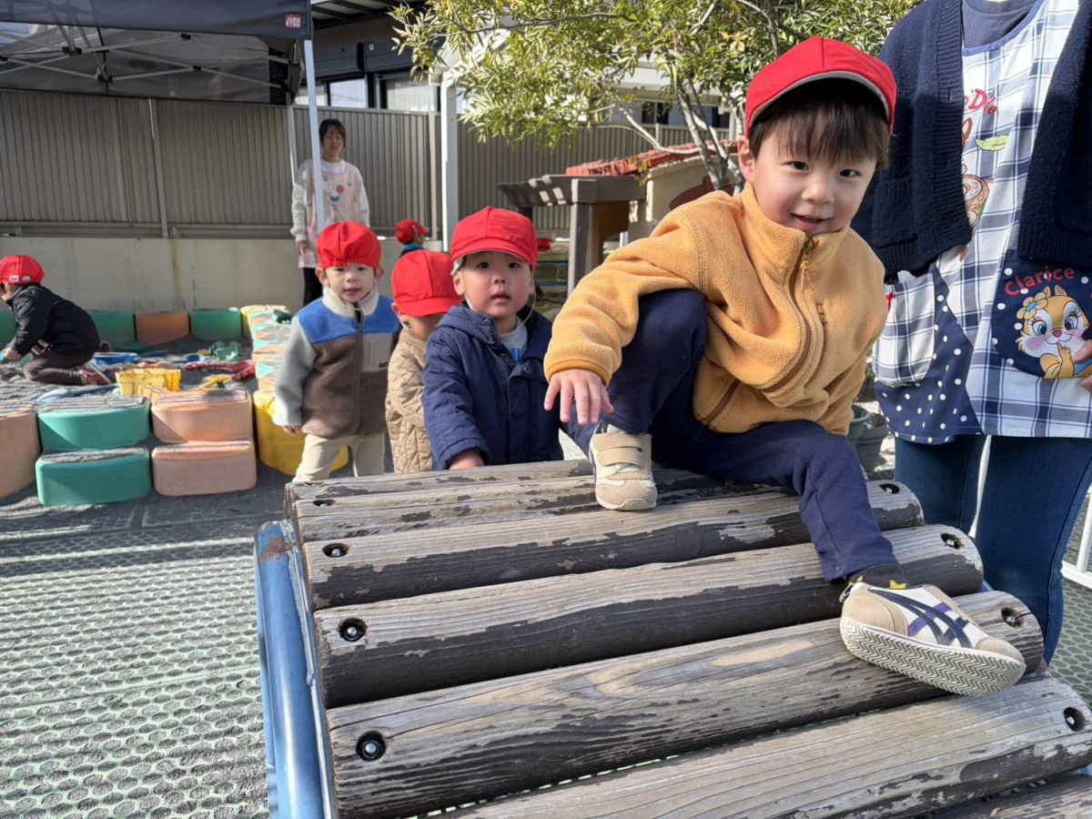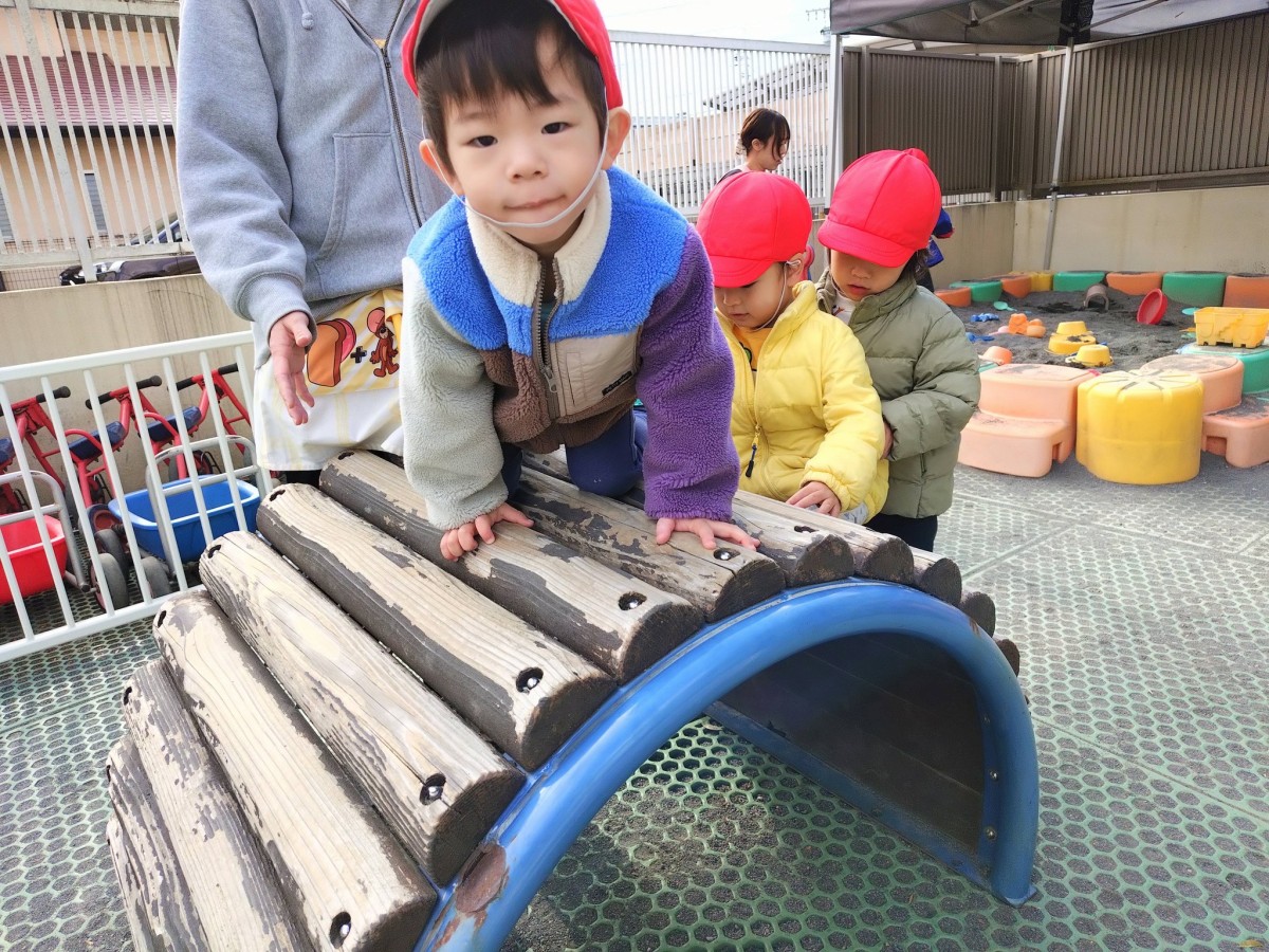 今日は園庭で遊びました。太鼓橋に挑戦するあか組さん。「よいしょ、よいしょ…」というかわいらしい掛け声と共に集中した様子で上り下りを楽しみました。手足を器用に使って上手に出来ました。