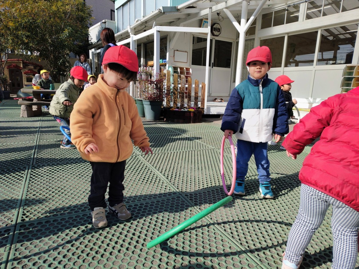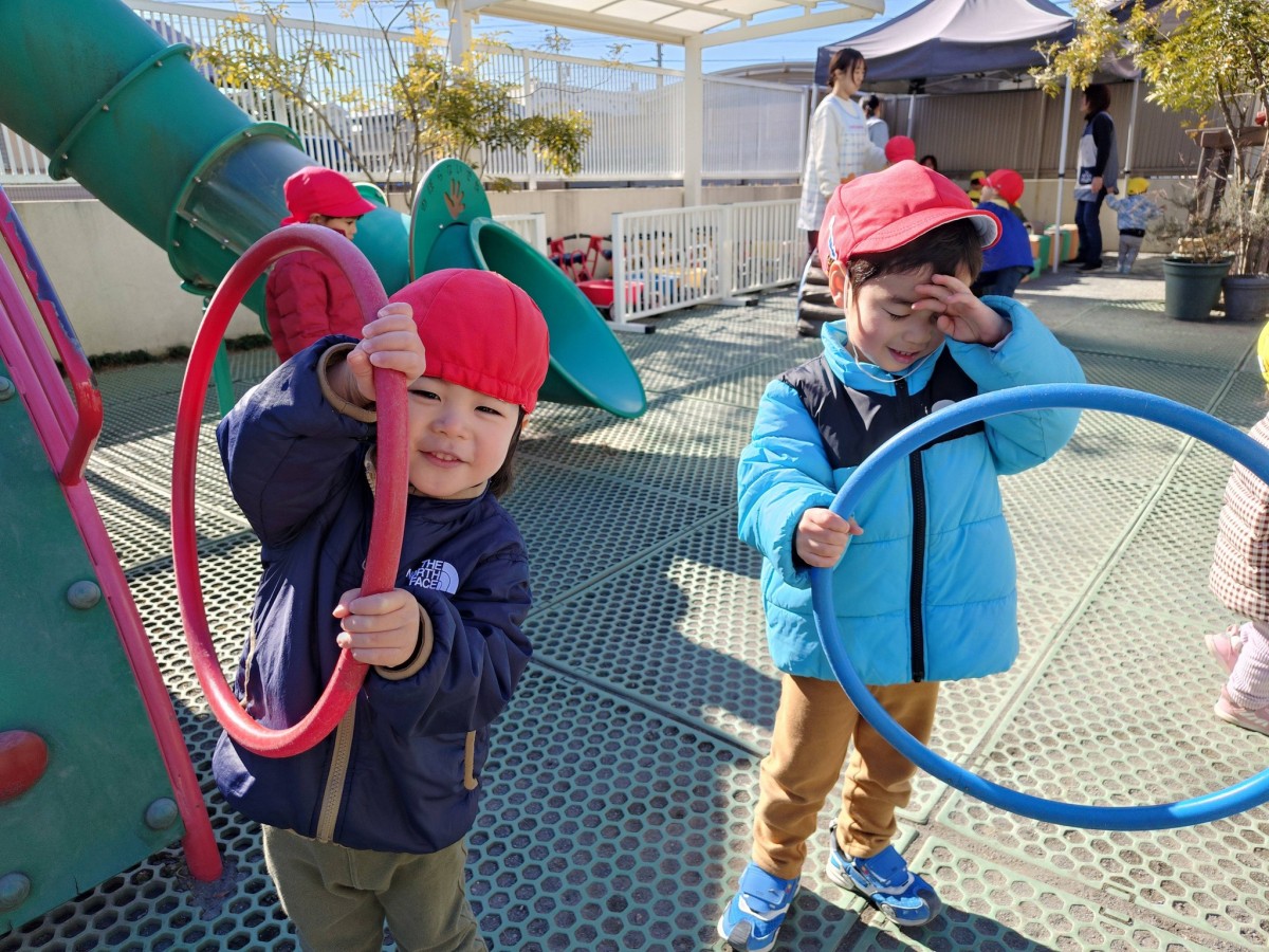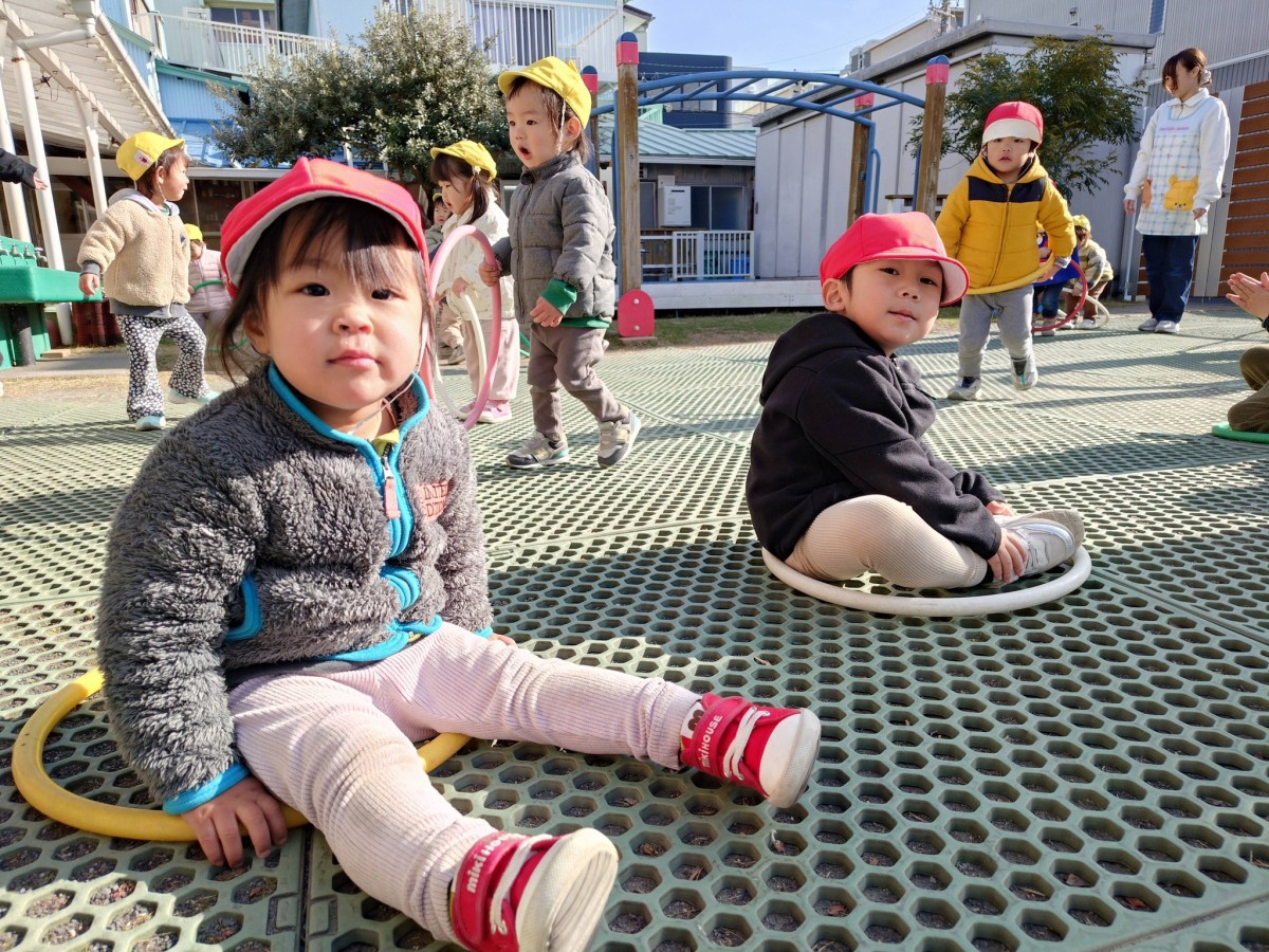 今日は、月刊誌を読んでから園庭で遊びました。フラフープを出すと興味津々なあか組さん。「見てて!」と言い、くるくると回したり「これね〜、お家だよ」とフラフープの中に座ってお家ごっこを楽しむ姿が見られました。