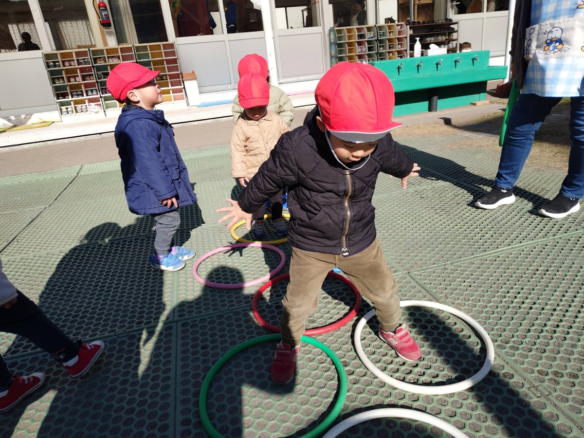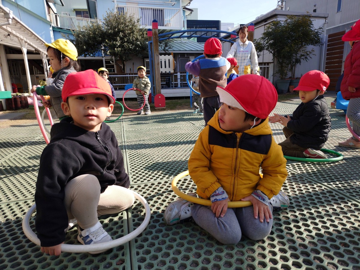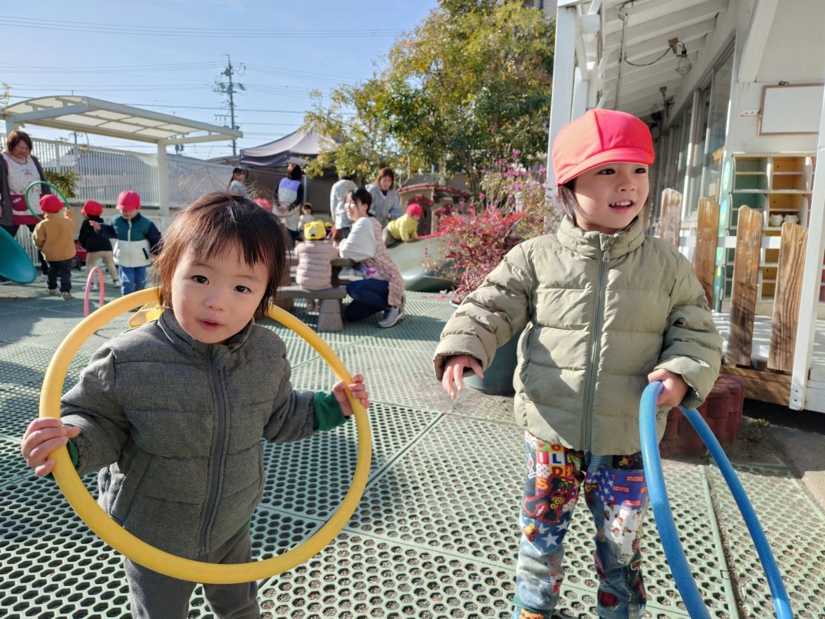 今日は、月刊誌を読んでから園庭で遊びました。フラフープを出すと興味津々なあか組さん。「見てて!」と言い、くるくると回したり「これね〜、お家だよ」とフラフープの中に座ってお家ごっこを楽しむ姿が見られました。