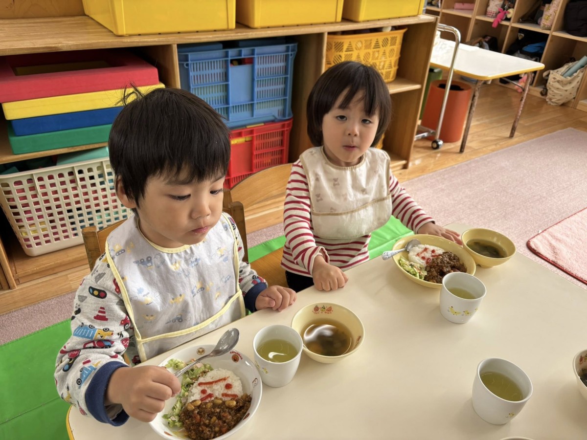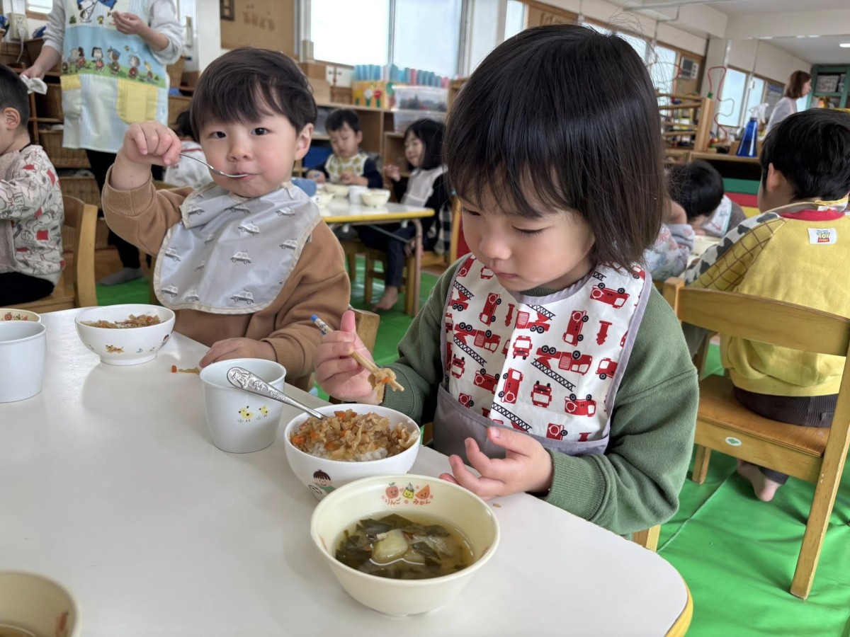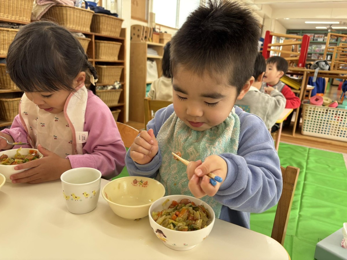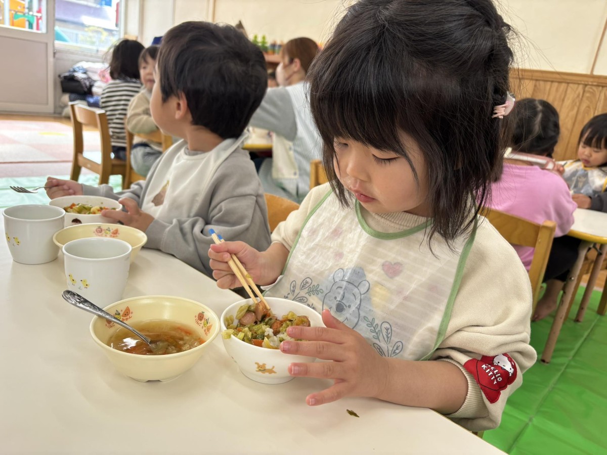 今日は発育測定の後に園庭で遊びました。発育測定では衣服の着脱を自分でしたり、スモックを自分で来てみたりと生活面でも成長が見られました。園庭ではお友だちと一緒に太鼓橋や滑り台に挑戦したり、三輪車やバイクでドライブをしたりととっても楽しそうに遊んでいました♪お給食の時間1日に5人ずつお箸の練習を始めてみました!保育士に持ち方を教えてもらい苦戦しながらも頑張ってお箸を使って食べていました。