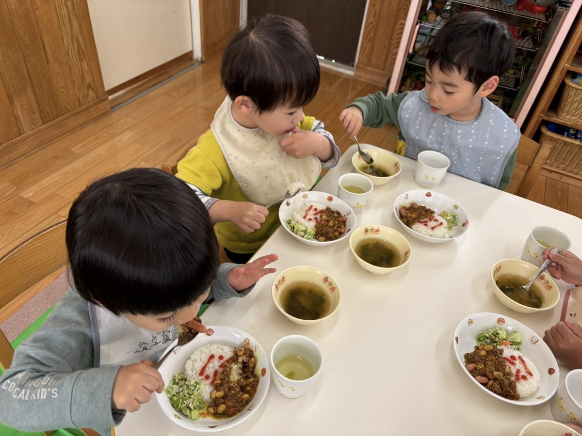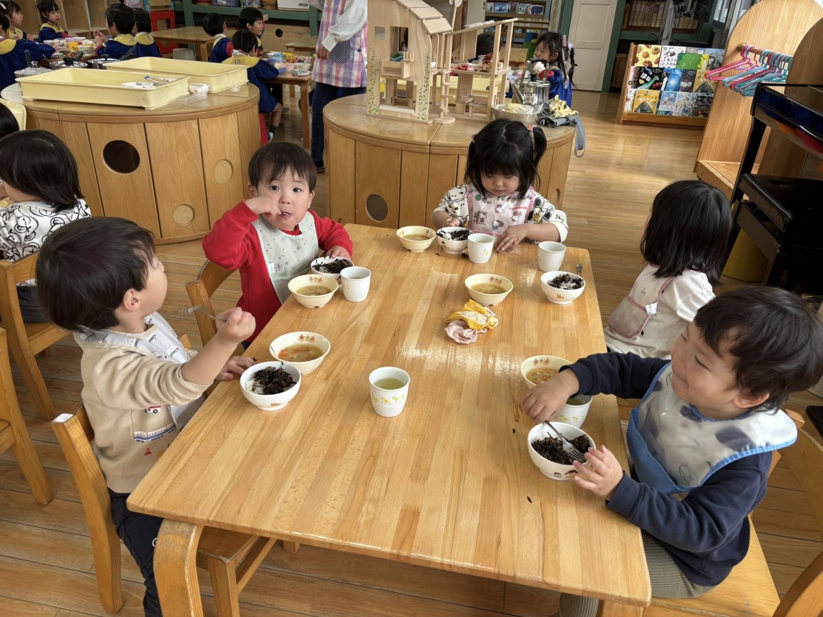 今日はリトミックの後に八雲神社までお散歩に行ってきました。リトミックでは「この音が鳴ったら雨だから傘さしてね」「大きな音が鳴ったら隠れてね」の声かけをしっかり聞いて音を聞きながら動く事ができました♪神社では遊具で遊んだり木の実や葉っぱ等の自然物で遊んだらして楽しみました。お散歩から帰るとお給食の時間!!節分の日だったのでオニのお顔のカレーを食べて鬼退治をしました♪