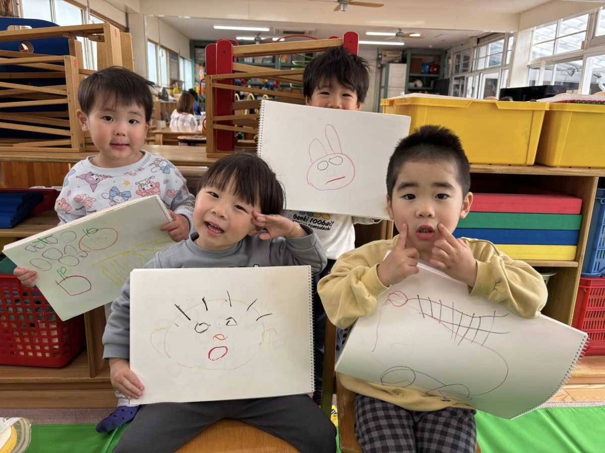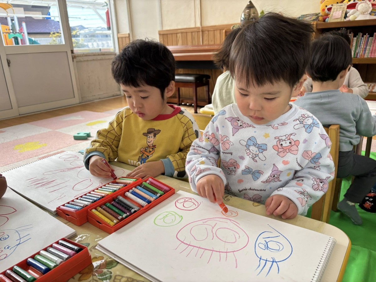 | 今日は、途中で雨が降ってきてしまったため園庭遊びのあとはお絵かきをしました。お絵かきでは、自分の顔やお父さんお母さんのお顔、アンパンマンや果物など、様々な形を描く子や大きな丸をぐるぐると描く子など様々でした。 |