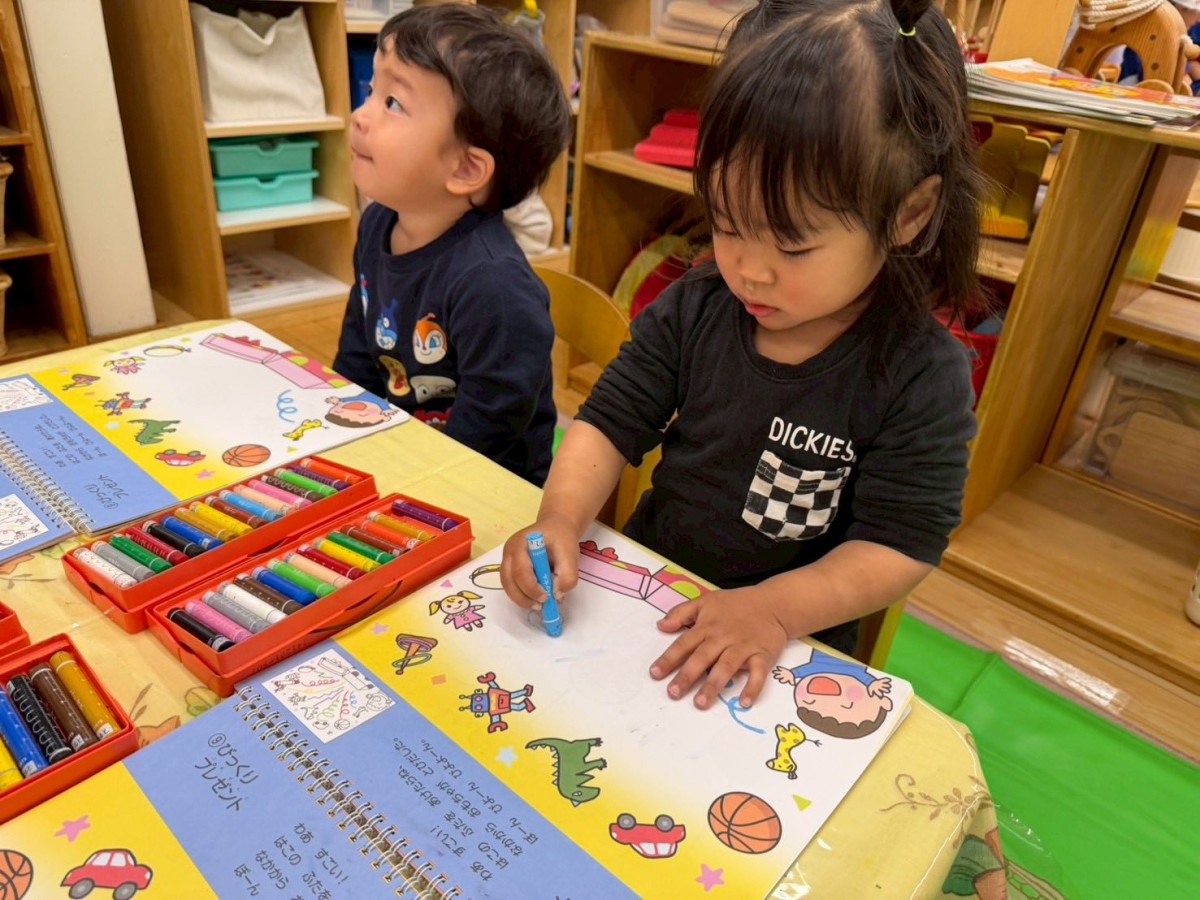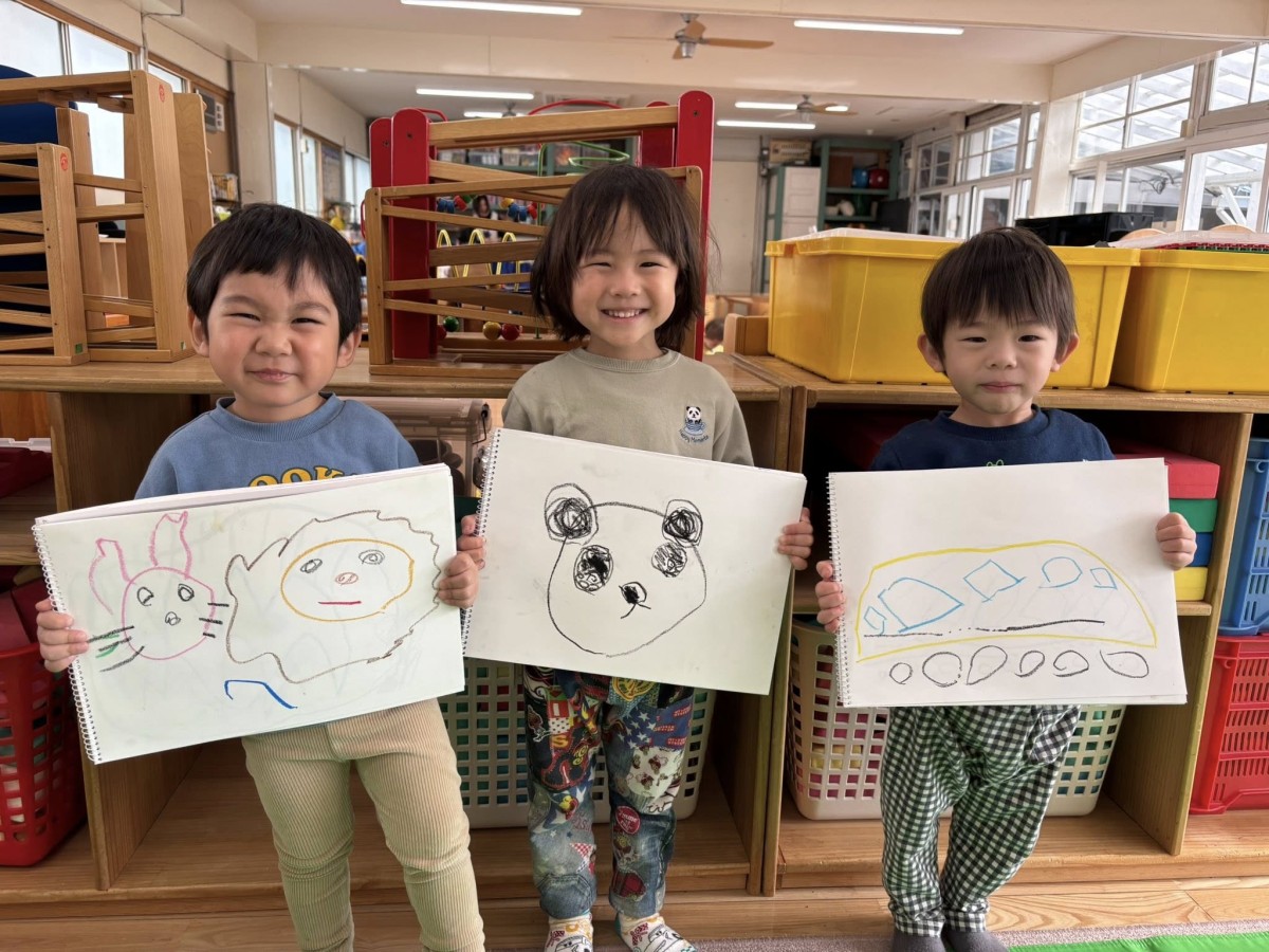 今日はお絵描きをした後に園庭で遊びました。お絵描きでは動物や乗り物、果物を描いて見せくれました。自分で描ける部分も多くなりお絵描きの時間が楽しいようです♪園庭ではかけっこや太鼓橋、大きな石や滑り台に挑戦して体を動かして楽しんでいました!