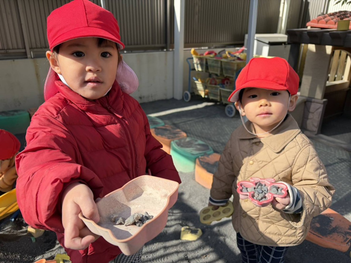 今日は園庭で遊びました。石集めを楽しむあか組さん。大きい石を見つけるとカップに入れ、カップに石が山程入ると「先生見て〜!石いっぱーい!」と嬉しそうに見せに来てくれました。他にも石の滑り台に何度も挑戦する子たちや、三輪車や四輪車で園庭のドライブを楽しむ子たちもいました。