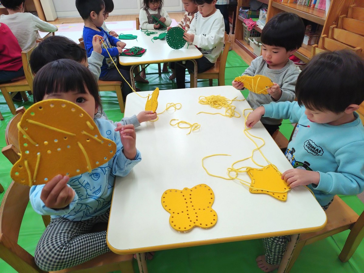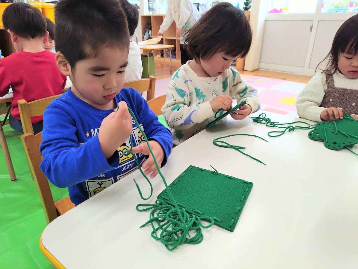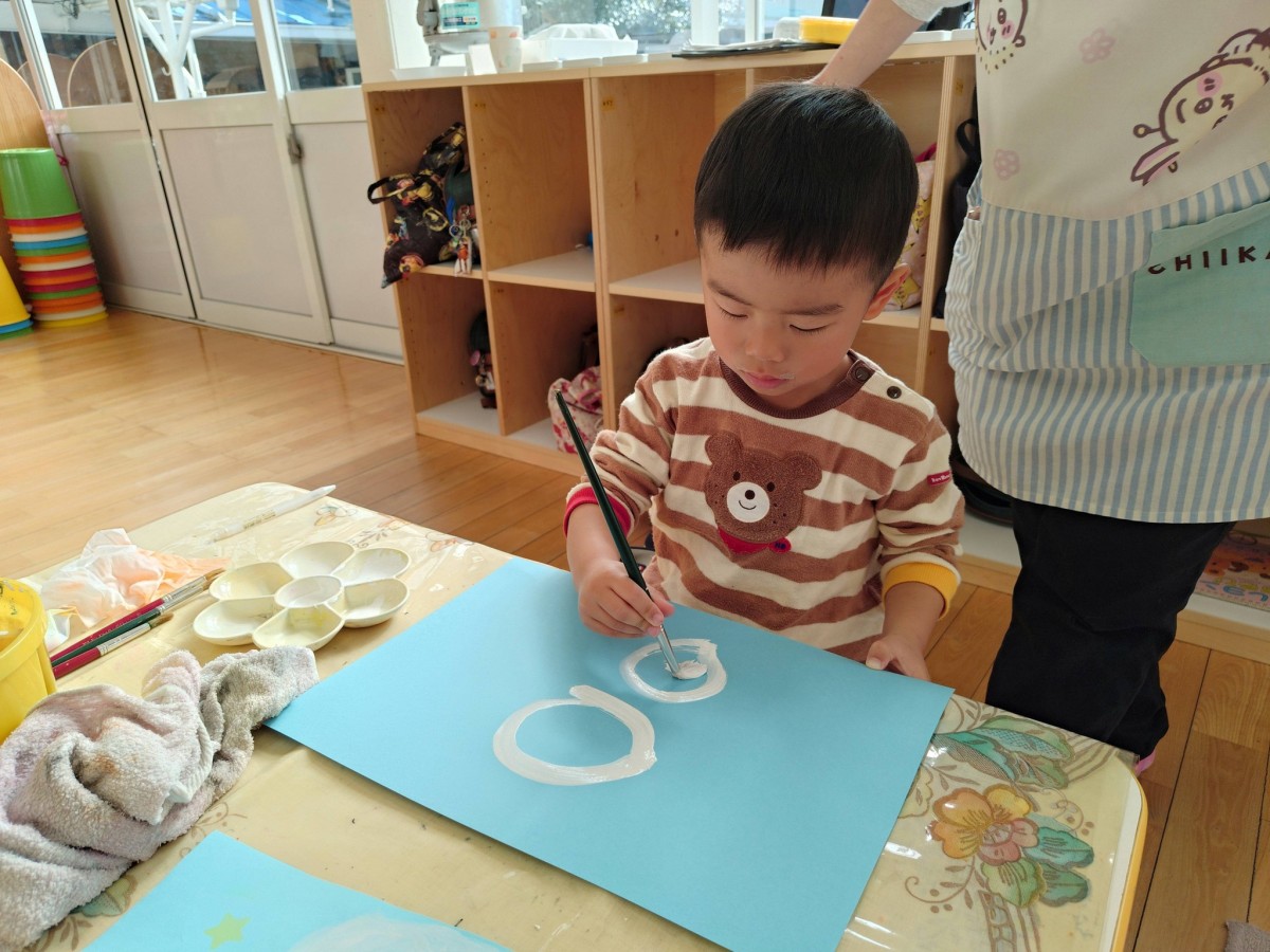 今日は2月の制作と室内遊びをしてから園庭で遊びました。制作では絵の具を使って雪だるまを描きました。保育士に援助してもらいながら慎重に丸を描き、塗りつぶしていきました。午後はキッズバンのひも通しで遊びました。小さい穴でも器用にひもを通し、綺麗に編めるようになってきました。