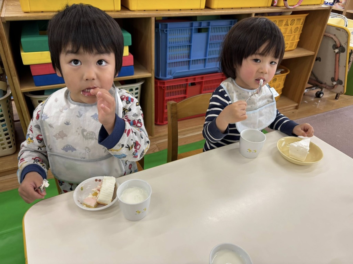 今日はお誕生会に参加した後に園庭で遊びました。あか組さんはお誕生日のお友だちがいなかったのですがみんなでお祝いをして保育士からのプレゼント「せんたくかあちゃん」を楽しんで見る事ができました。お誕生会のお給食やケーキも特別感があり「おいしい」と言いながら食べていました♪