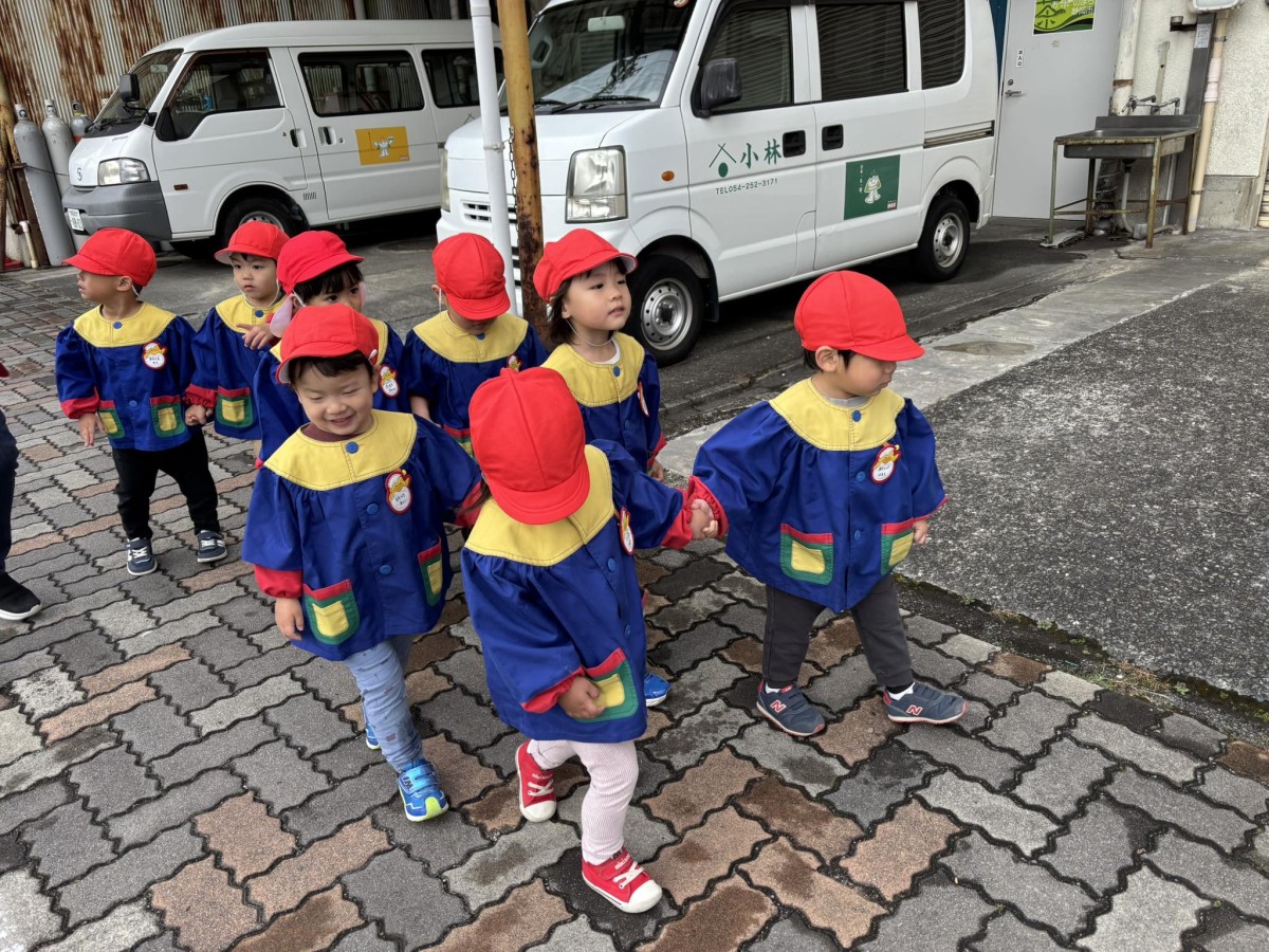 今日は園周辺を手繋ぎでお散歩に行った後、園庭で遊びました。お散歩の途中でバスやトラックがたくさん通りかかり、「バスきたよ!」「おっきいトラックだ!」と大喜びのあか組さん。元気いっぱい声を出したり、一生懸命手を振ったりしていました。