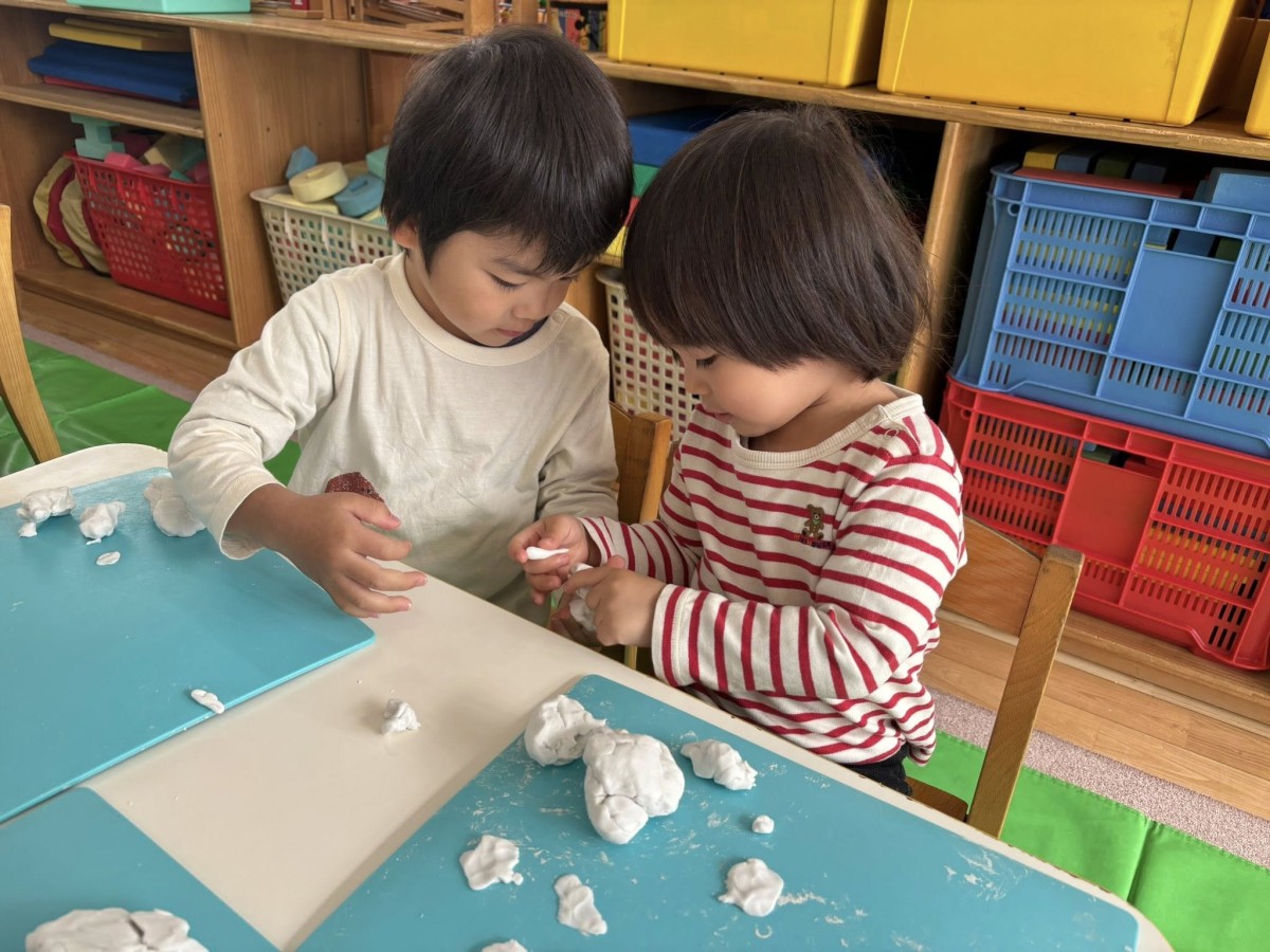 今日は粘土遊びをした後に園庭で遊びました。粘土ではトンネル、充電器、ハンバーガーカタツムリと色々なものを作って見せてくれました。園庭では大型遊具の滑り台に挑戦したり、三輪車やお砂場でたくさん体を動かして遊びました!お友だちとのやり取りがとっても楽しそうです♪