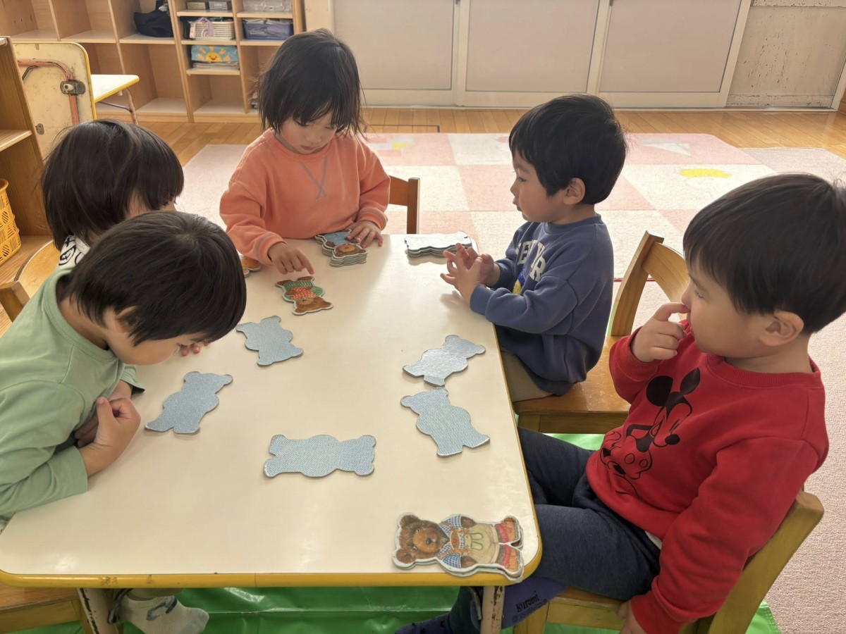| 今日は少しだけ園庭で遊んだ後ステージでもりのおふろをやりました。その後は室内でキッズバンやパズル、ブロックで遊びました。キッズバンの絵合わせでは、難しい問題でも「これかな?」「ここはこれ!」といったように自分で考えしっかひと当てはめることが出来ました。 |