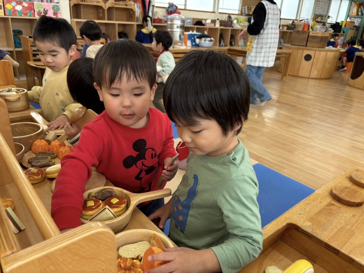 今日はカード遊びをした後に園庭で遊びました。メモリーを1机ずつやってみてルールを覚えながらカードを取る楽しさを知って盛り上がっていました。お給食は幼児さんのテーブルを借りて食べてみました。「お兄さんのお部屋だね」と言っていたり、ご飯を食べた後におままごとで遊んだりととっても嬉しそうでした♪