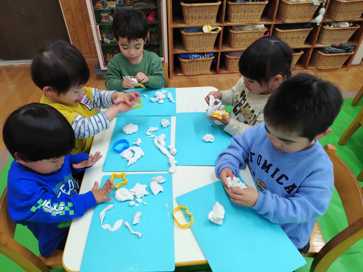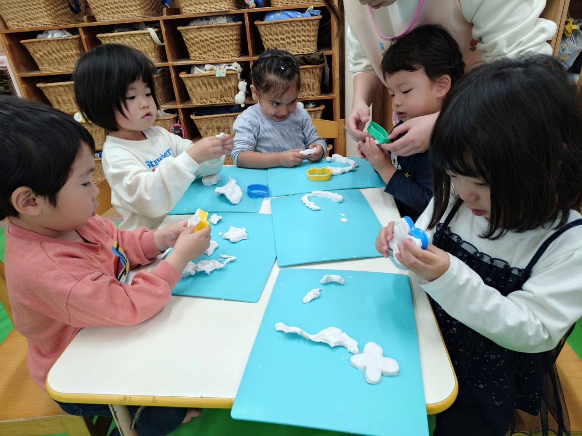 今日は園庭で沢山遊びました。デッキの滑り台で滑っていると静電気がパチッとなるのが面白い様子のあか組さん。「パチッとした〜!」と笑っていました。午後は粘土遊びをしました。型抜きに挑戦するあか組さん。保育士に手伝ってもらいながら型を抜き、上手く形ができると「見て〜!できたよ〜!」と嬉しそうに何度も挑戦しました。