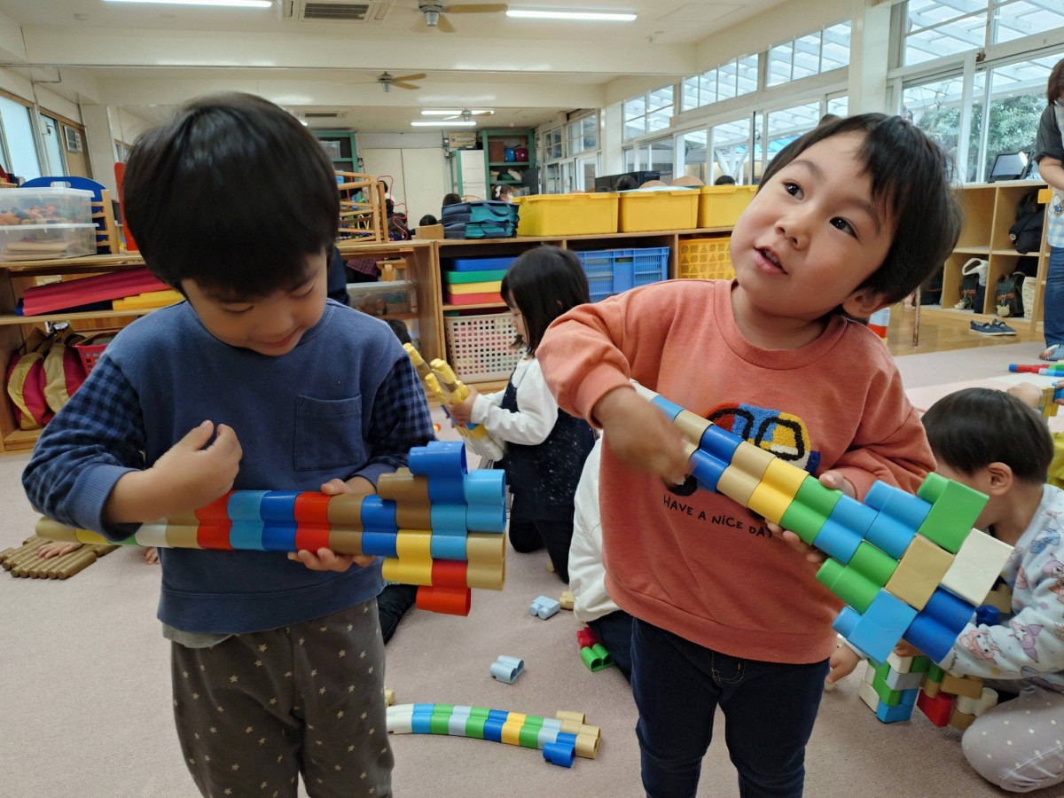 今日は園庭で遊びました。お友達と追いかけっこを楽しむあか組さん。大型遊具の周りを何周走ってもニコニコの笑顔で体力がだいぶついてきた事を感じました。午後はブロックで遊びました。
