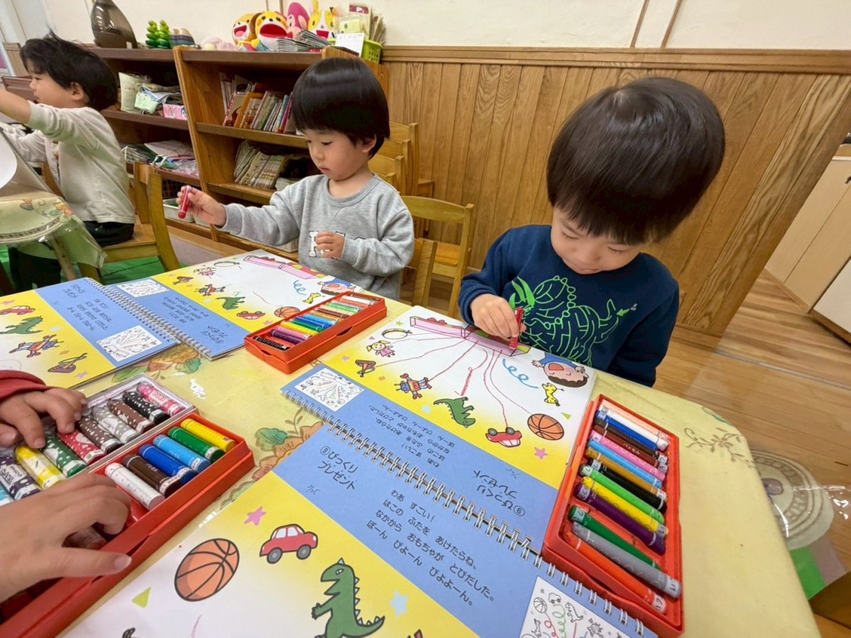 今日は午前中は園庭で遊び、午後は制作と月刊誌のシール貼りをやりました。制作では、顔のパーツをクレヨンで描いていきました。お顔を描くのにも慣れてきた様子のあか組さん。目や鼻、口を上手に描きかわいらしいお顔を完成させていました。