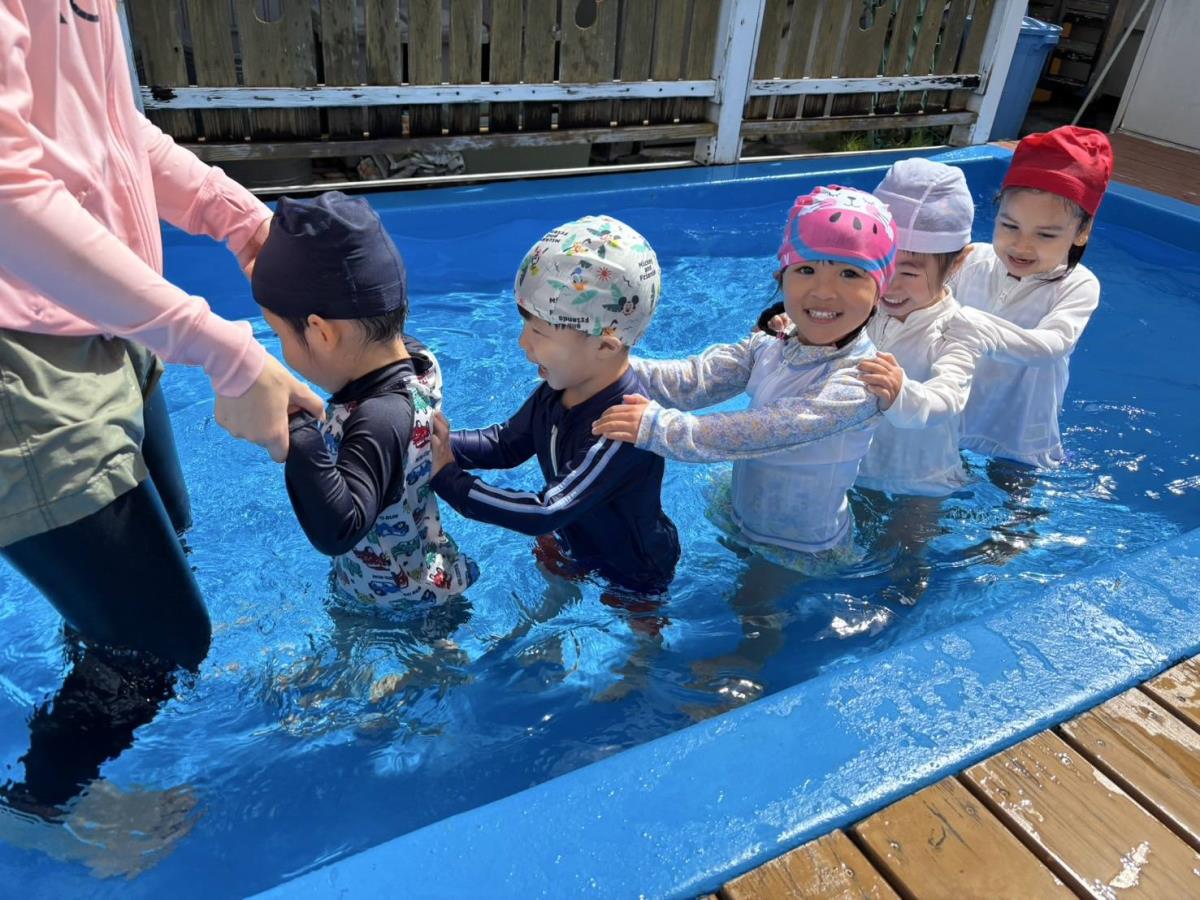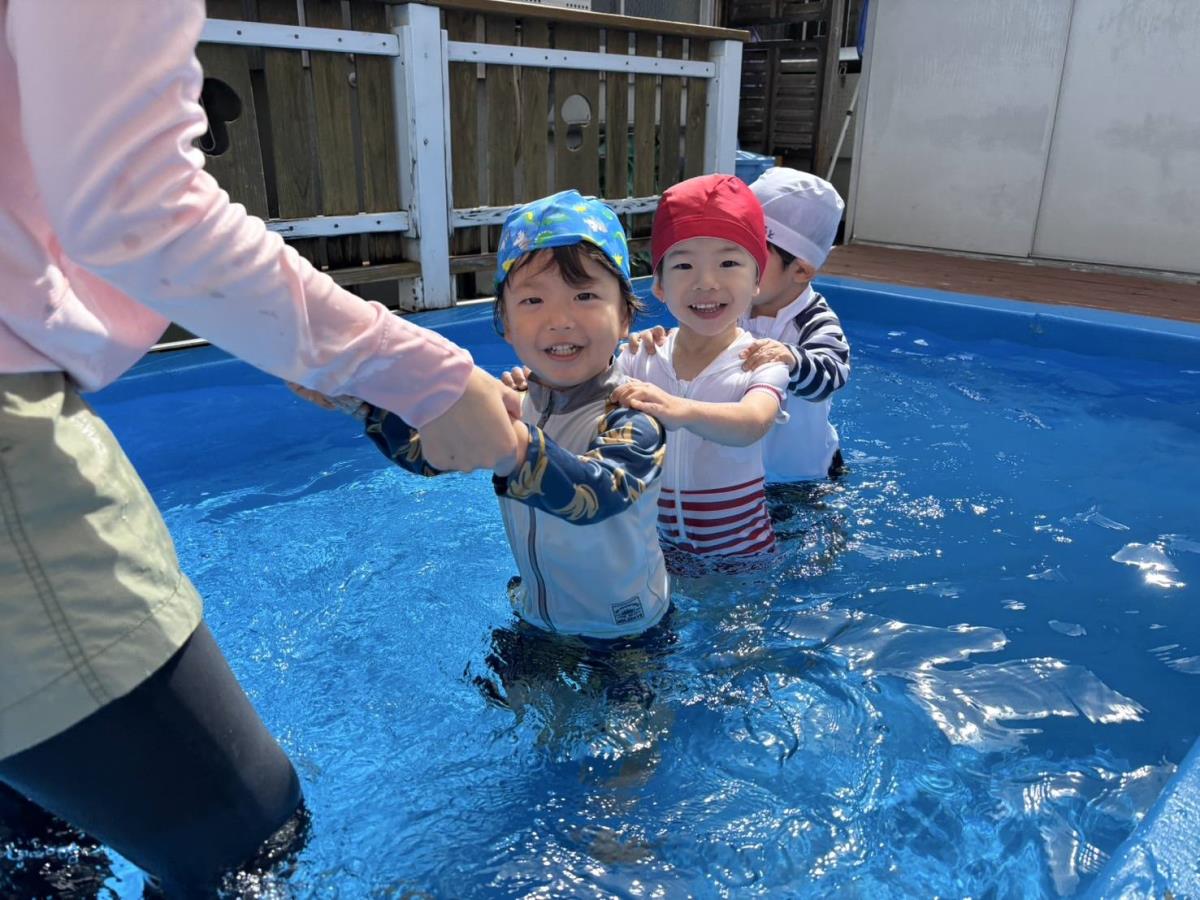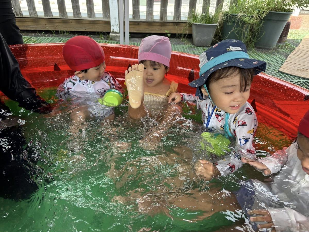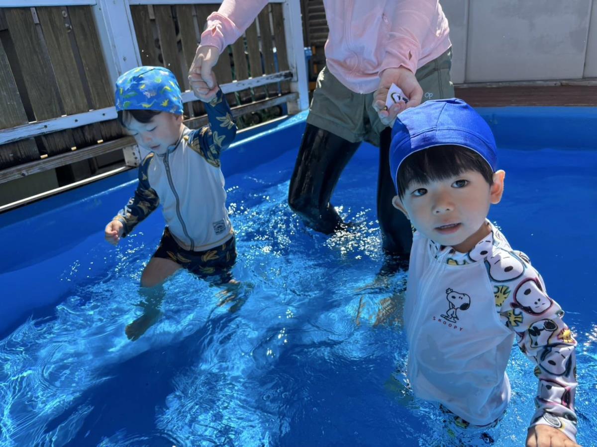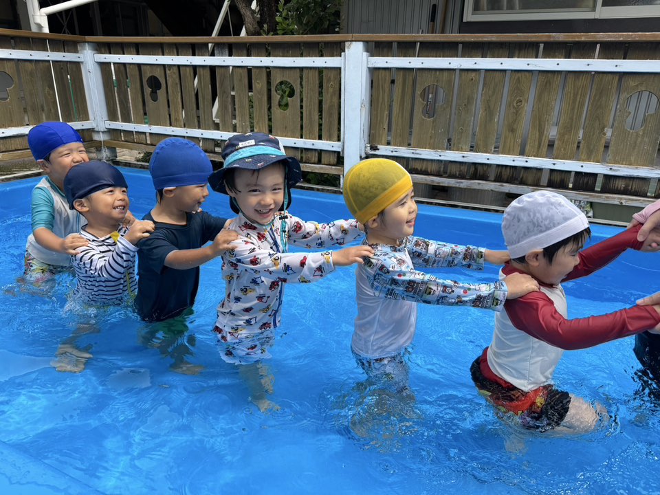 今日は大きなプールで水遊びをしました。お腹まで浸かる時にプールに座る事ができるようになったり、ワニさん泳ぎに挑戦してみたりと日々遊びが進化しています!お友だちと電車になって歩くのがとっても楽しいようです♪ |