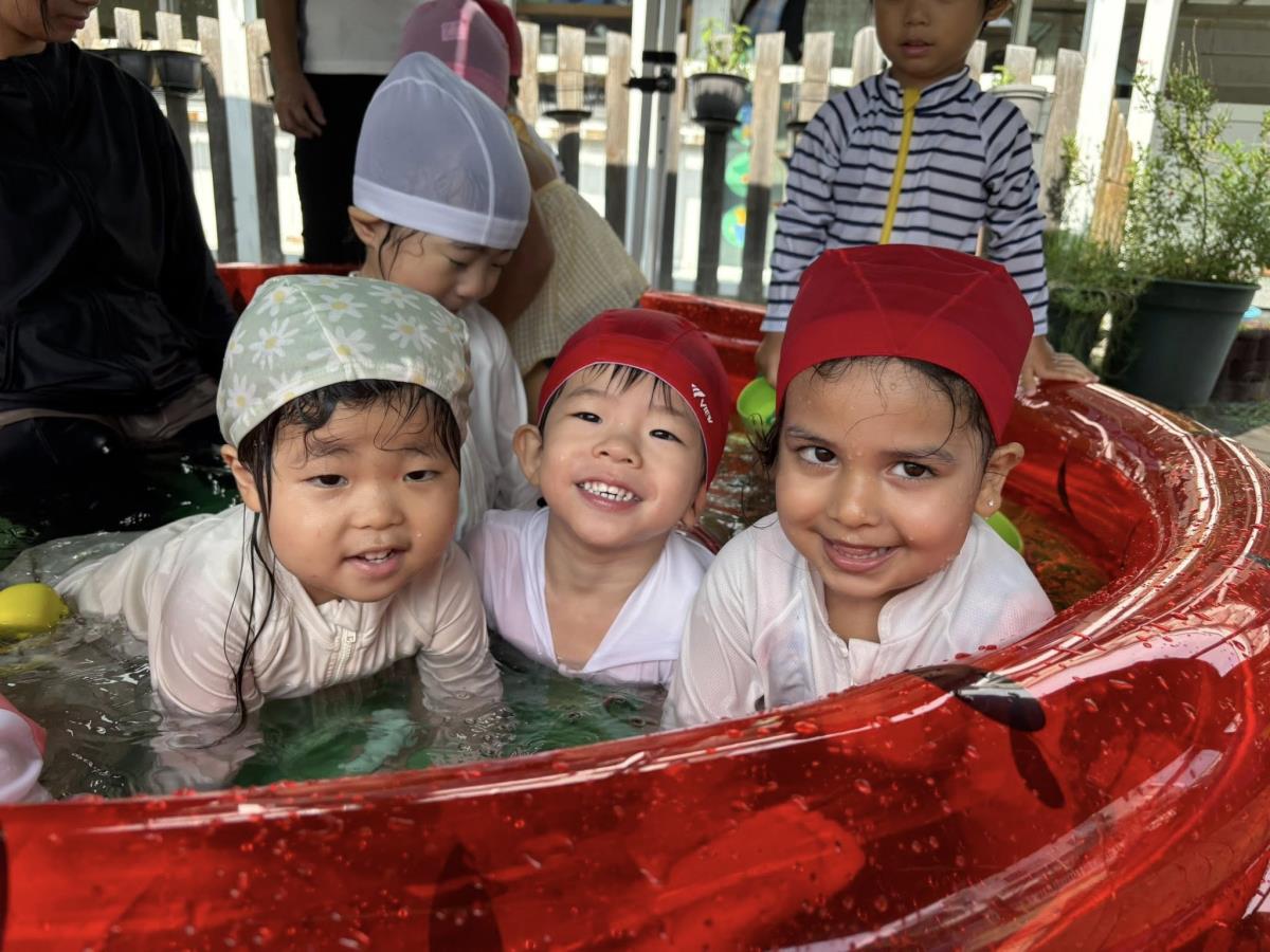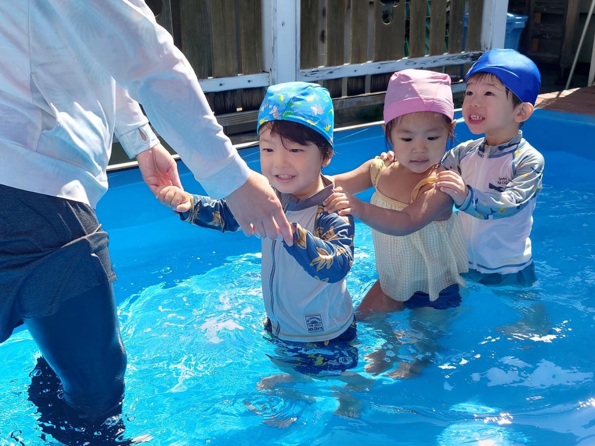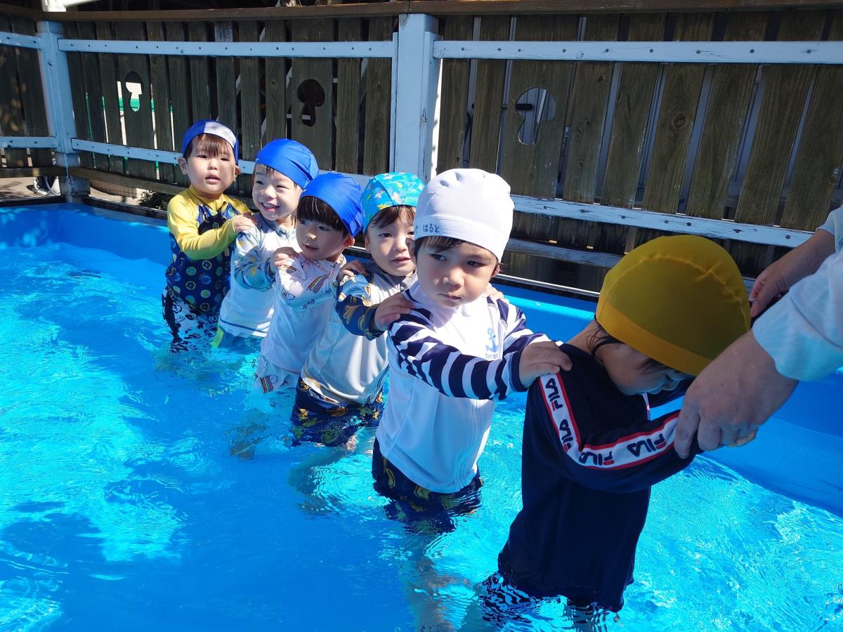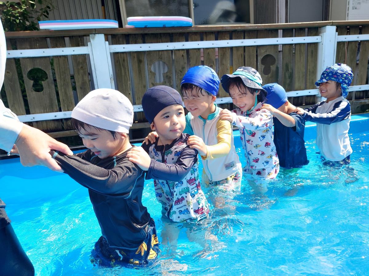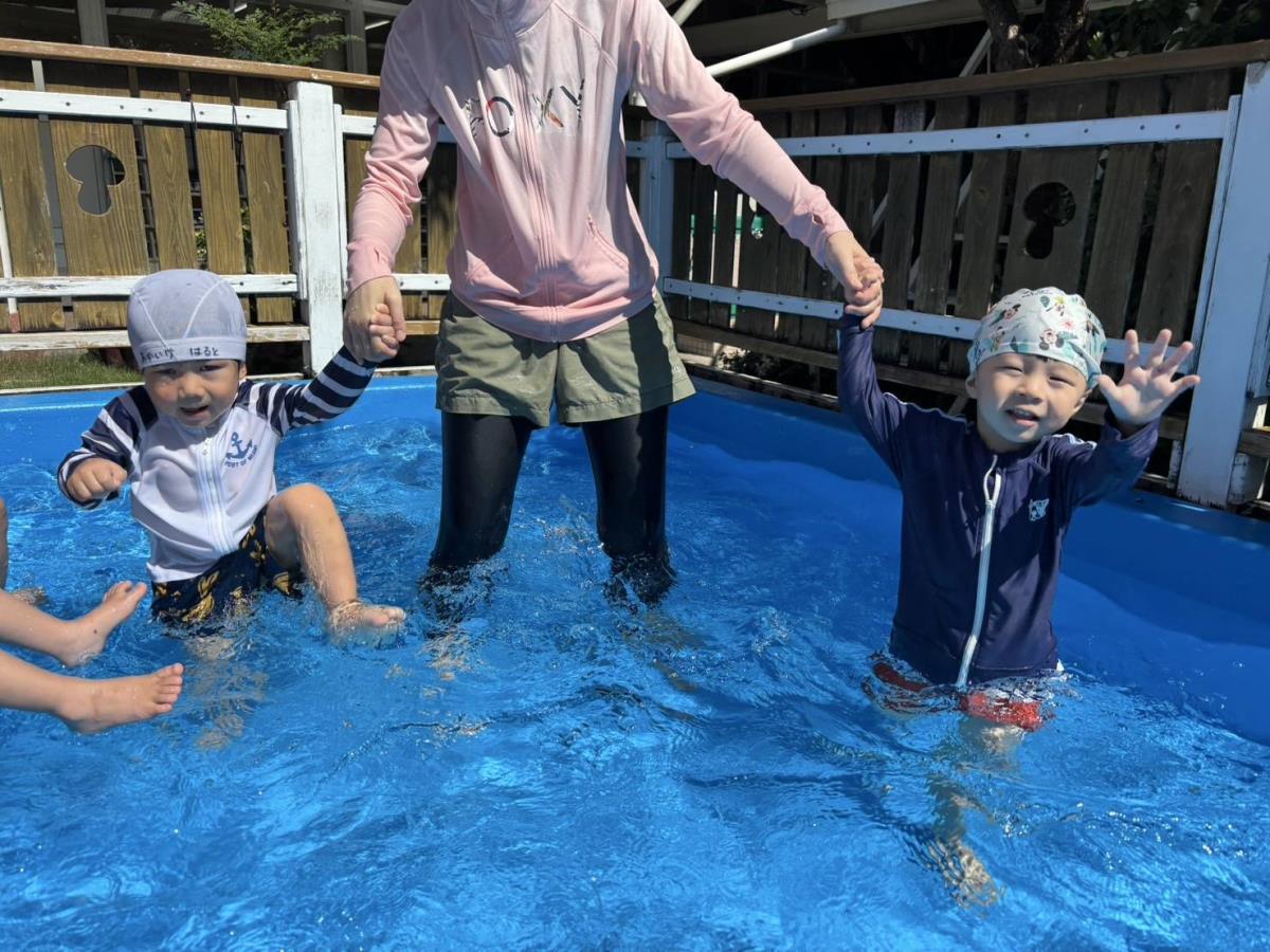 今日は大きなプールで水遊びをしました。お腹まで浸かる時にプールに座る事ができるようになったり、ワニさん泳ぎに挑戦してみたりと日々遊びが進化しています!お友だちと電車になって歩くのがとっても楽しいようです♪ |