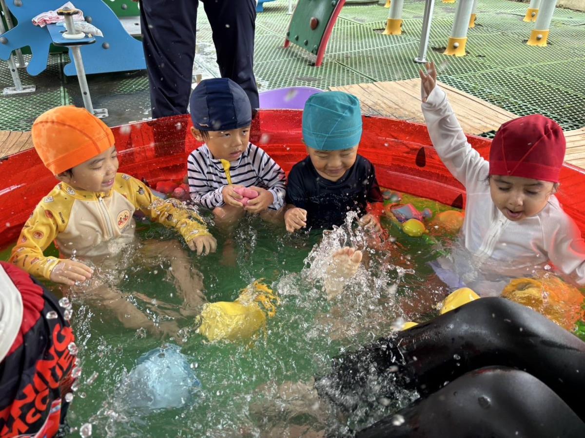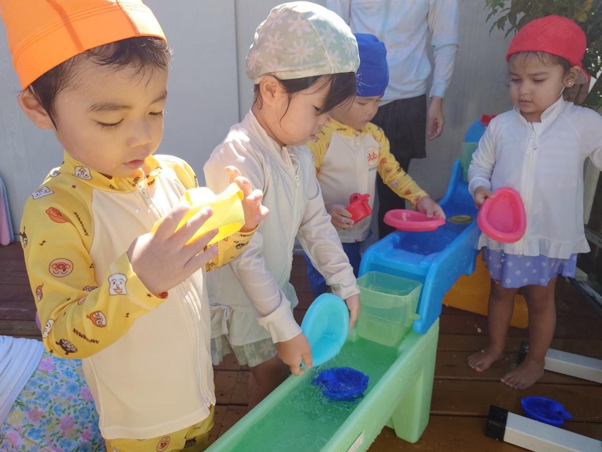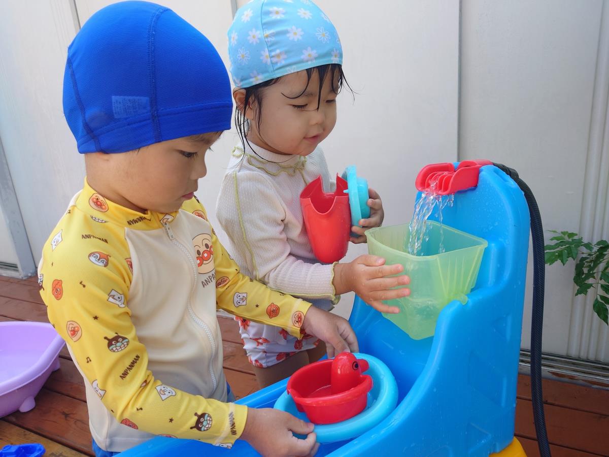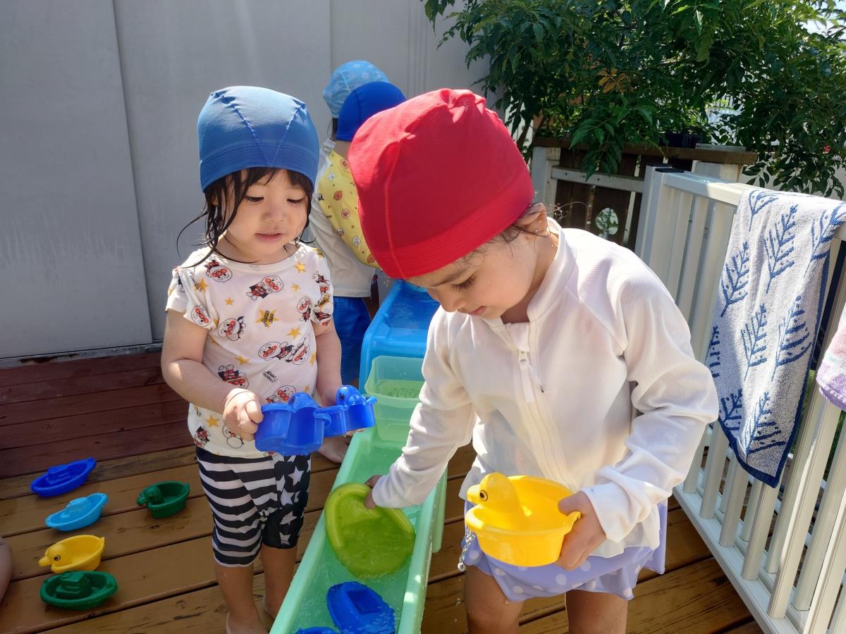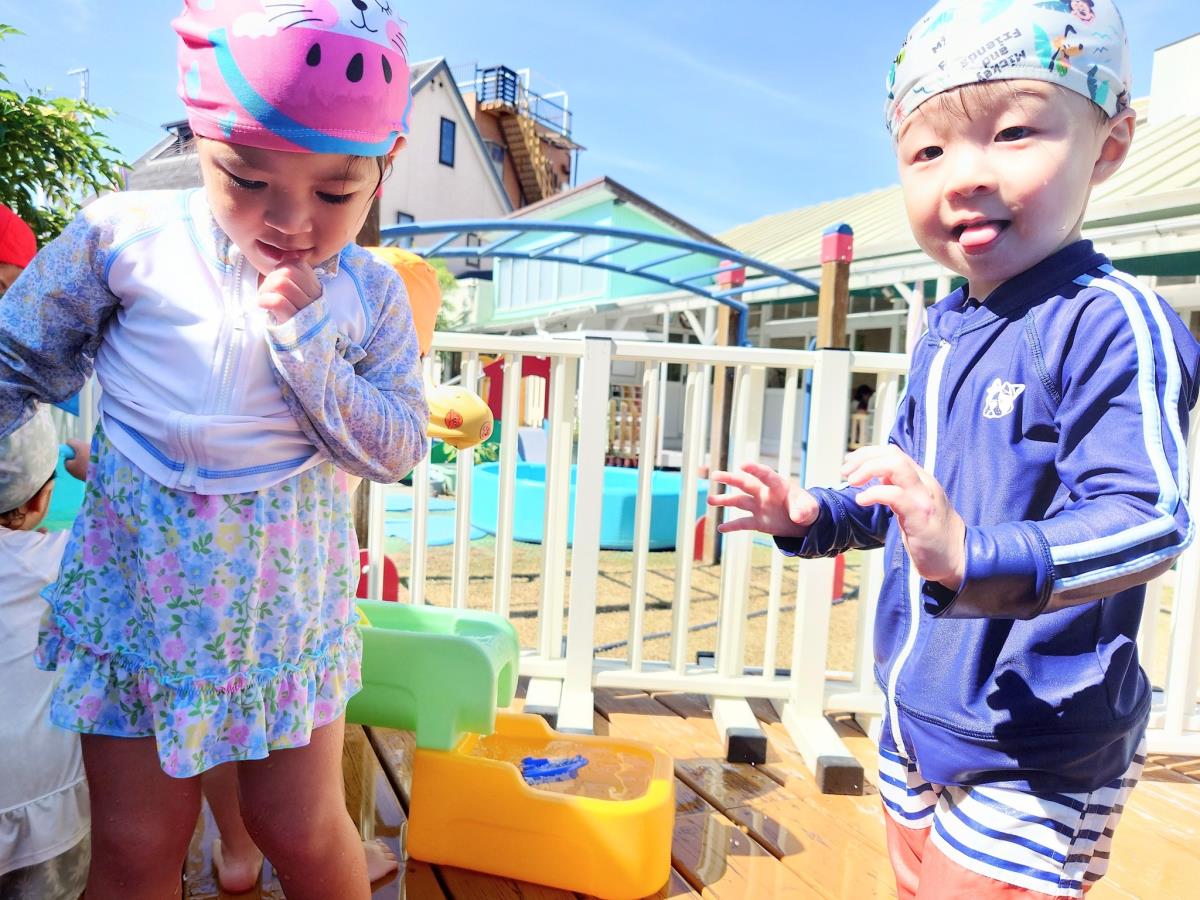 今日は大きなプールで水遊びをしました。お腹まで浸かる時にプールに座る事ができるようになったり、ワニさん泳ぎに挑戦してみたりと日々遊びが進化しています!お友だちと電車になって歩くのがとっても楽しいようです♪ |