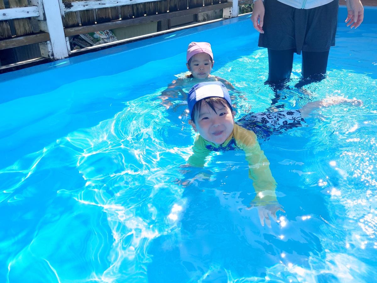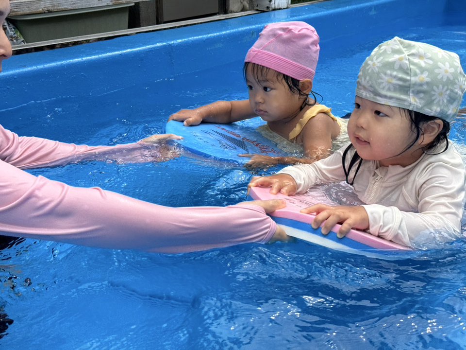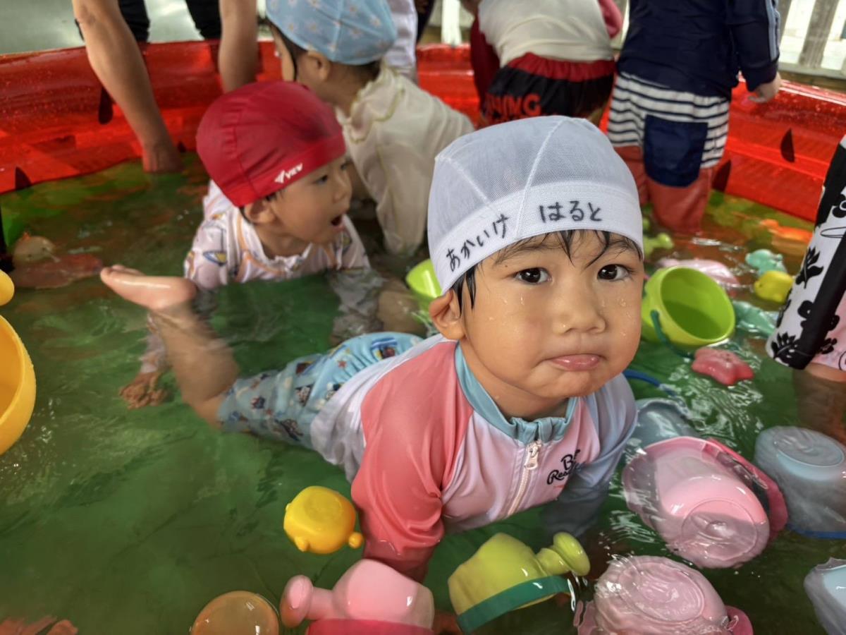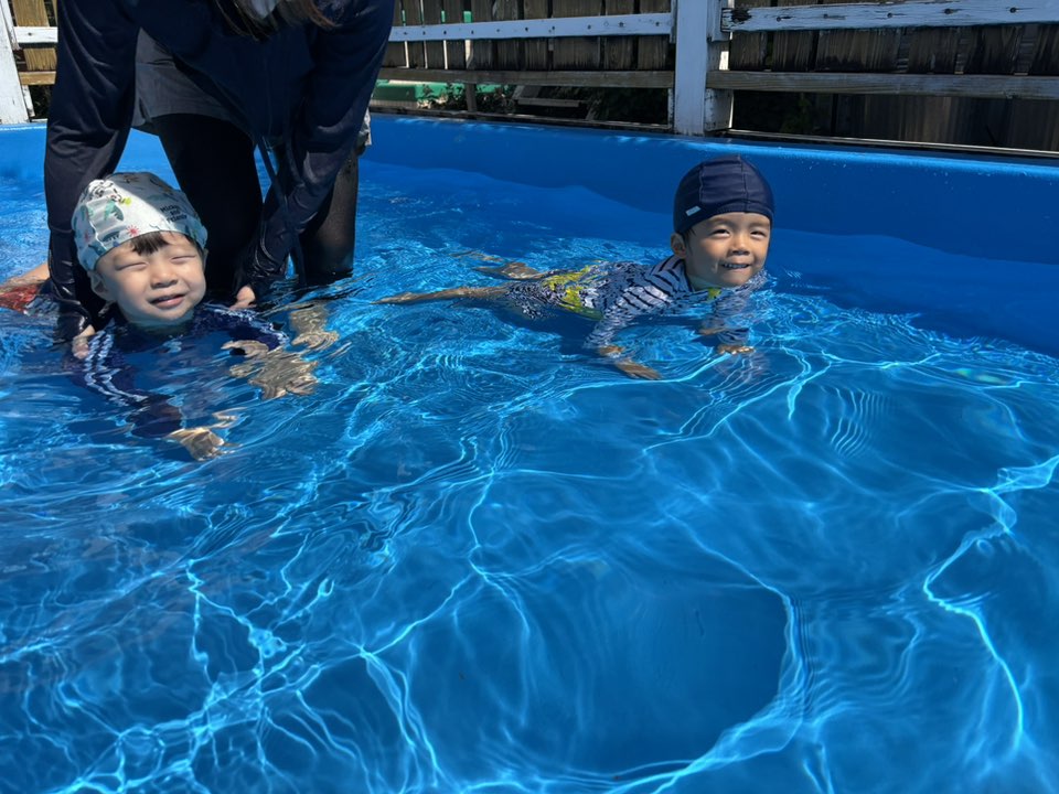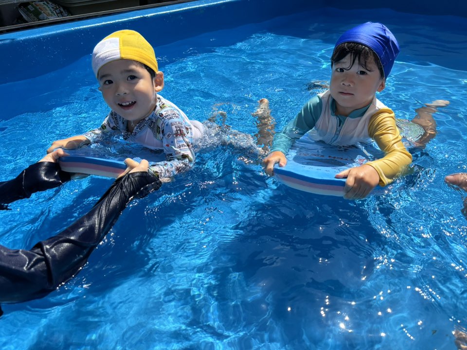 今日はきっずばんや小さいプールで水遊びをしました。小さいプールでも座って足をバタバタしてみたり、手で水面をバシャバシャしでたりと楽しく遊んでいます!!ワニさん泳ぎは「できるよ」「見てて」と言いながらお友だちと一緒にやって見せてくれます♪