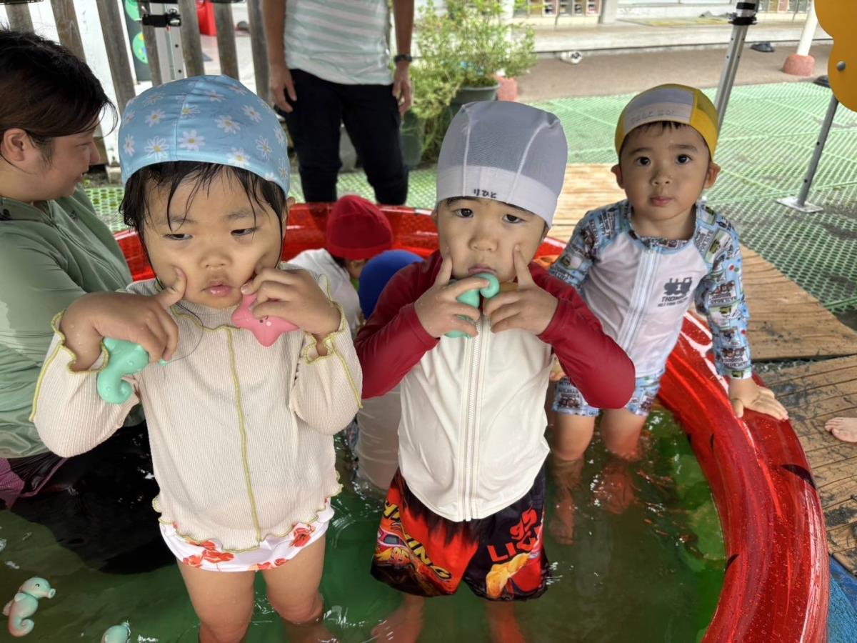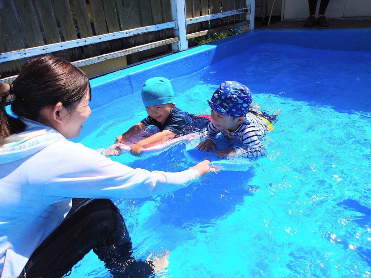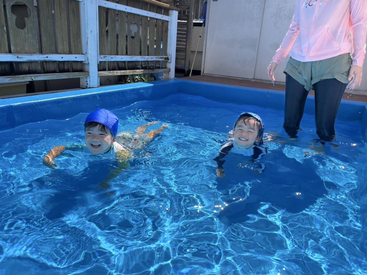 今日はきっずばんや小さいプールで水遊びをしました。小さいプールでも座って足をバタバタしてみたり、手で水面をバシャバシャしでたりと楽しく遊んでいます!!ワニさん泳ぎは「できるよ」「見てて」と言いながらお友だちと一緒にやって見せてくれます♪