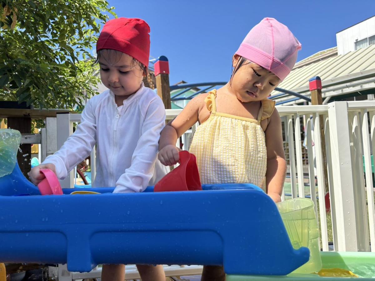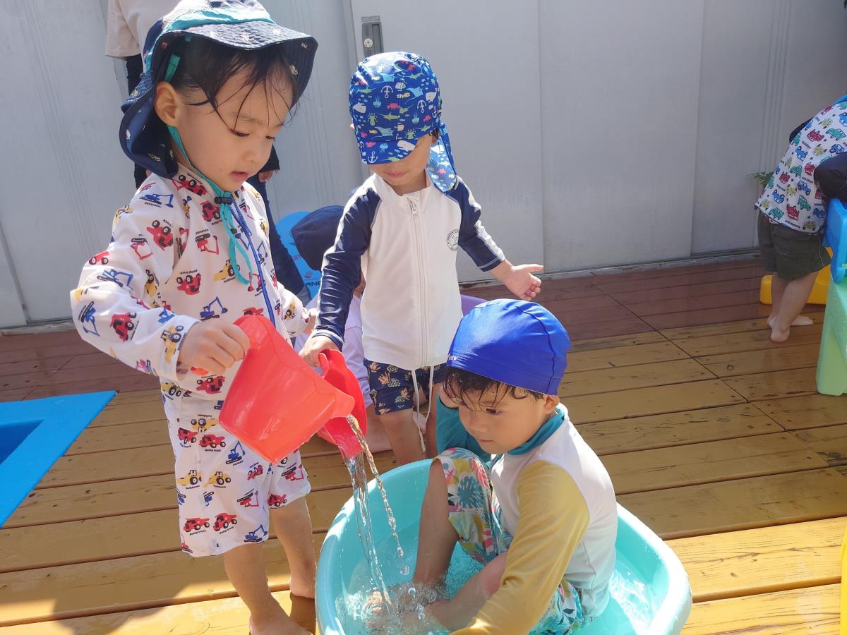 今日は木のおもちゃで遊んだり小さなプールで水遊びをしたりしました。お友だちや先生と水かけっこをするのが楽しいあか組さんはみんなで水をかけ合って楽しんでいます♪ワニさん泳ぎも上手になり気持ちよさそうに泳いで見せてくれます! |