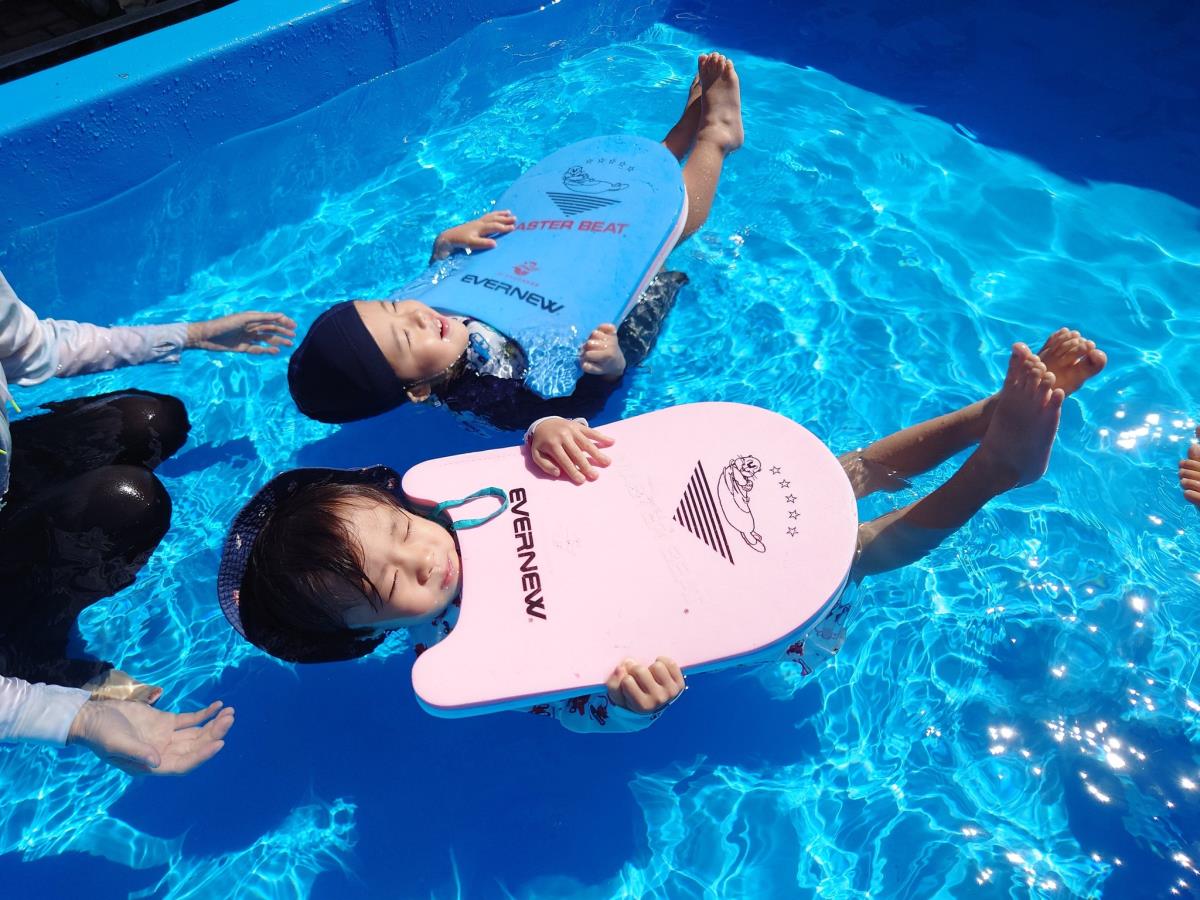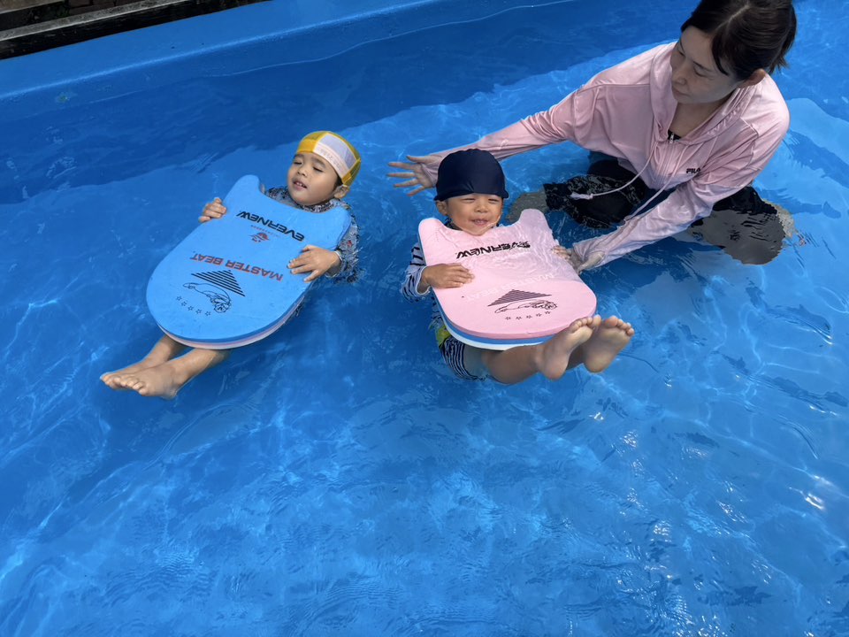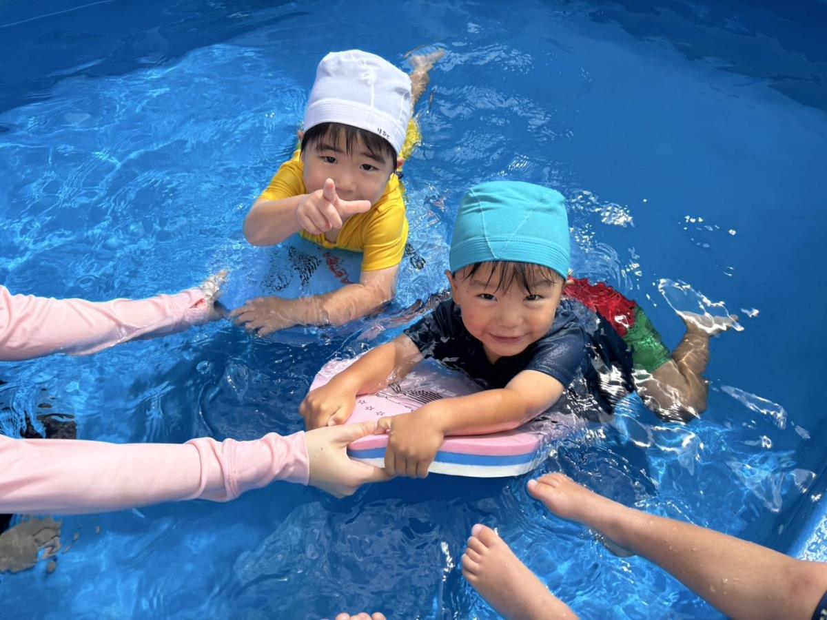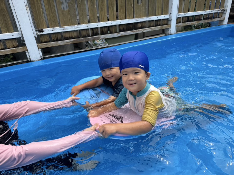 今日は大きなプールで水遊びをしました。ワニさん泳ぎをサポートなしで挑戦してみたりビート板に挑戦してみたりと大きなプールにすっかり慣れて楽しく遊ぶ事ができています♪最後にプールサイドで遊ぶのも楽しみのひとつの様です!