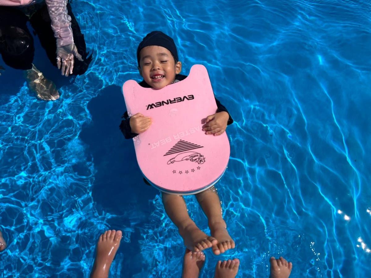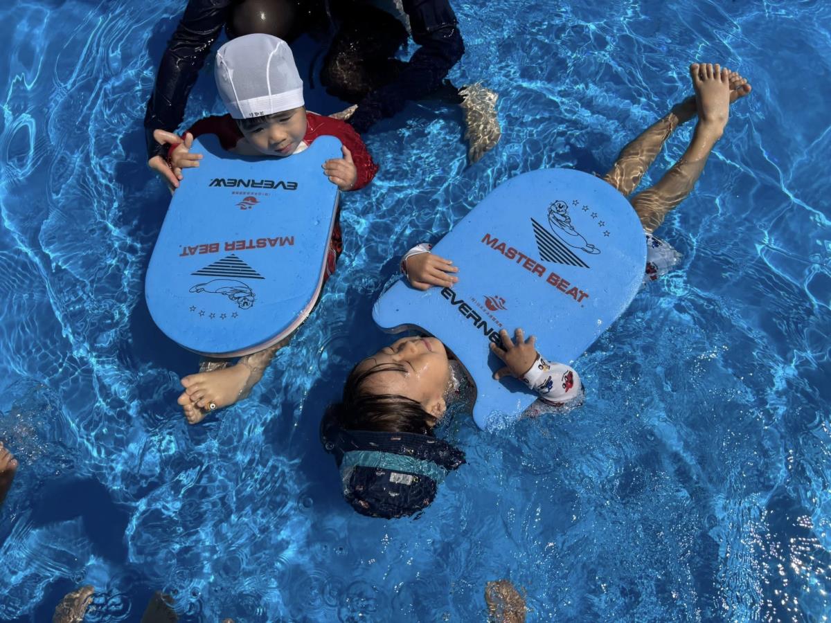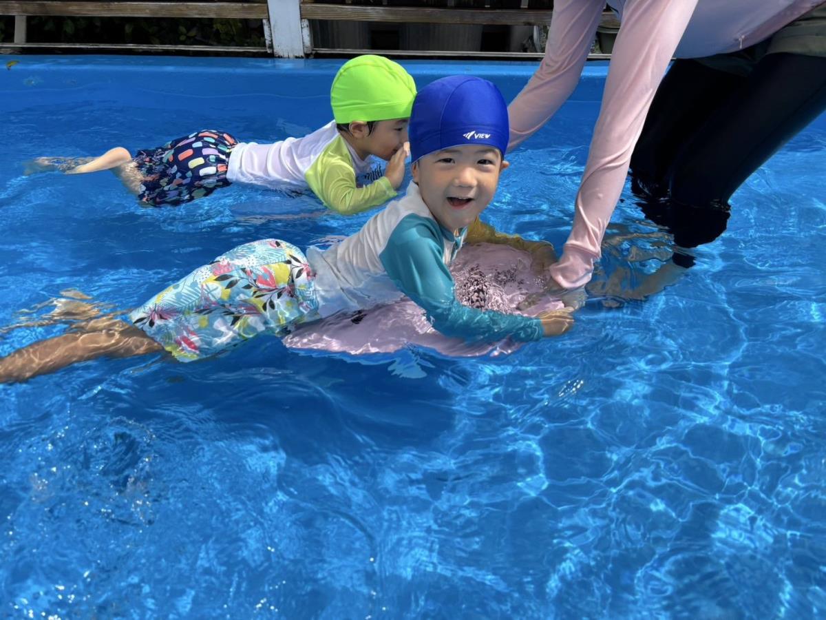 今日は大きなプールで水遊びをしました。ワニさん泳ぎをサポートなしで挑戦してみたりビート板に挑戦してみたりと大きなプールにすっかり慣れて楽しく遊ぶ事ができています♪最後にプールサイドで遊ぶのも楽しみのひとつの様です!