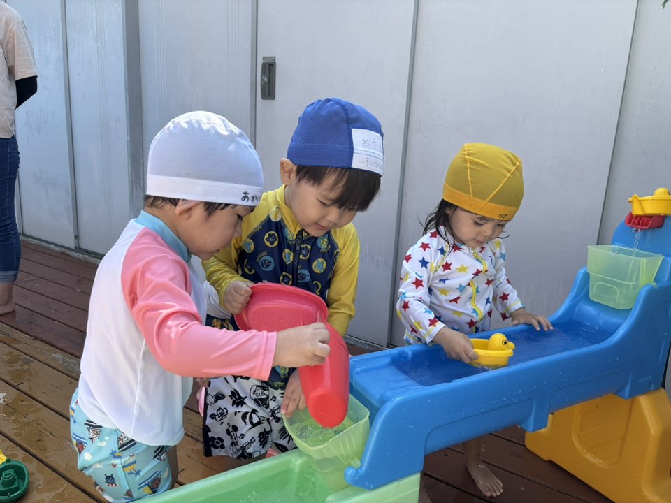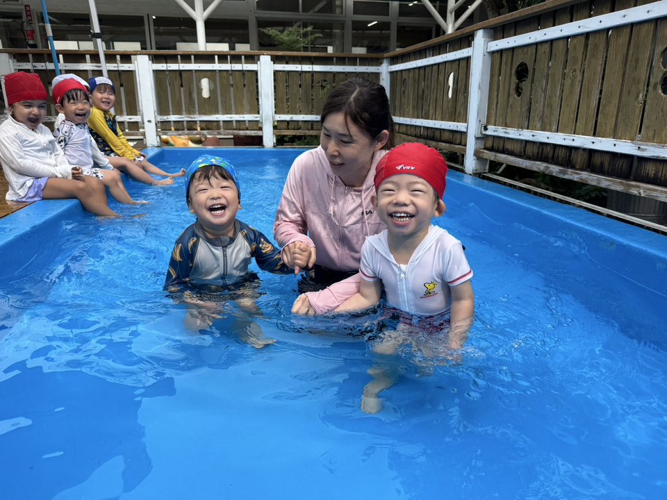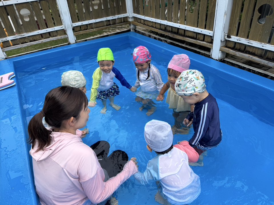 今日は小さいプールで水遊びをしました。お友だちや先生たちと水かけっこを楽しんだりお友だちと一緒にワニさん泳ぎをしたりして楽しみました!!プールでもお友だちとの関わりが多くなり楽しく遊ぶ事ができています♪