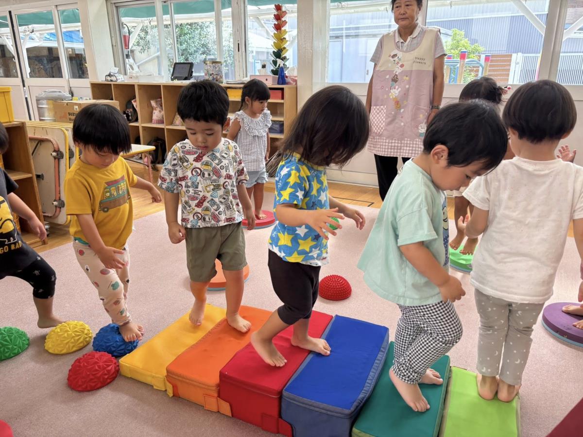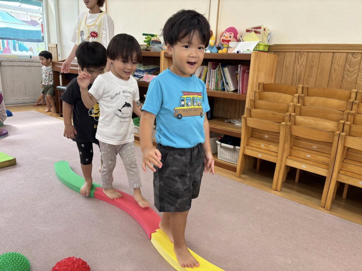 今日はお部屋で階段マットやレール平均台、ミュージックパット等を出して体を動かして遊んだ後に色々なブロックや車のおもちゃを出して遊びました。ミュージックパットは踏むと音が出るのが面白かったようで何回も踏んでみたり、音の違いを楽しんだりしながら遊んでいました♪平均台や階段では順番に並んで歩いている姿がかわいかったです!