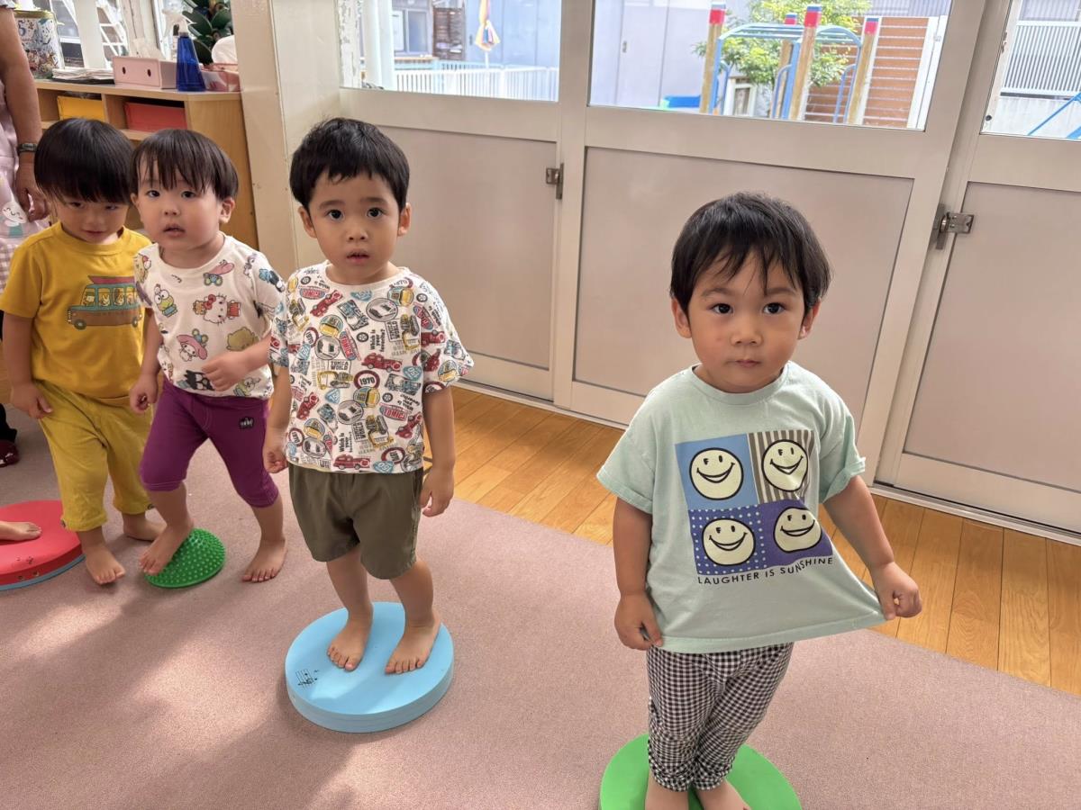 今日はお部屋で木のおもちゃを出して遊んだり、玄関の通路の所でジャンプをしたり、滑り台をしたりして遊びました。まだ丸の中をジャンプしていく事は難しそうですがお友だちとピョンピョンとっても楽しそうです♪ |