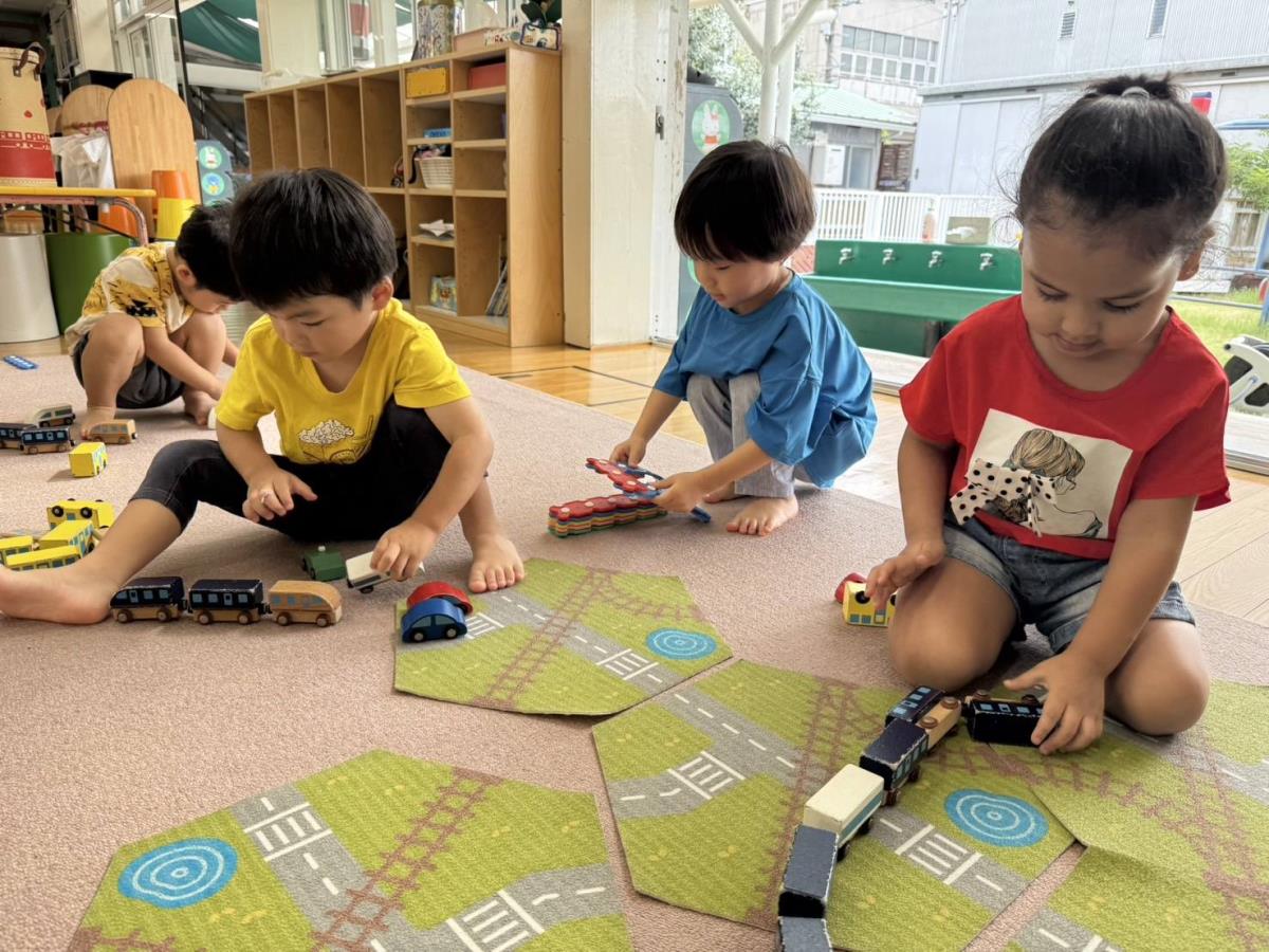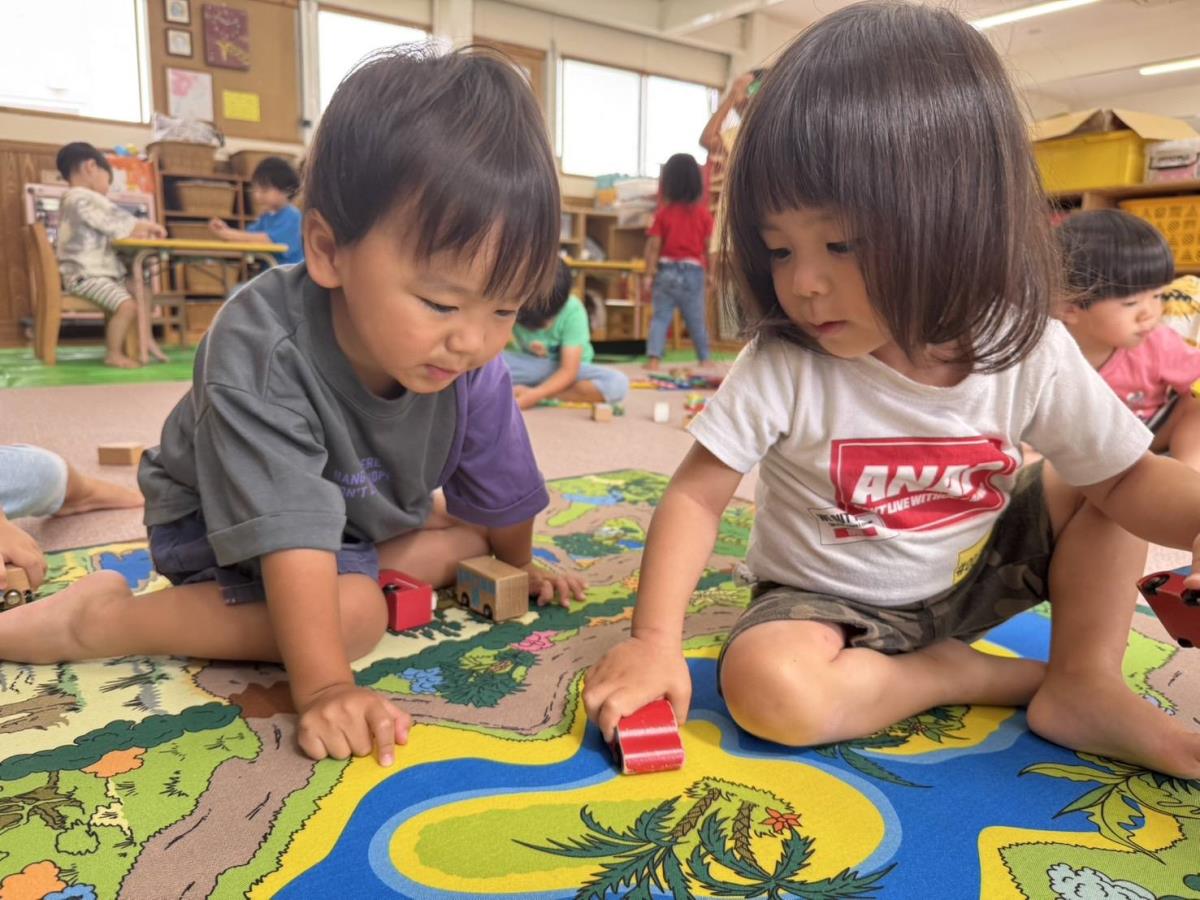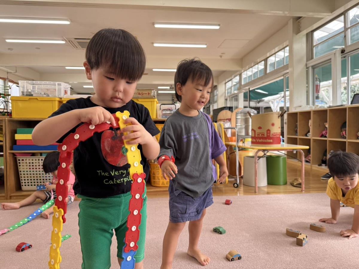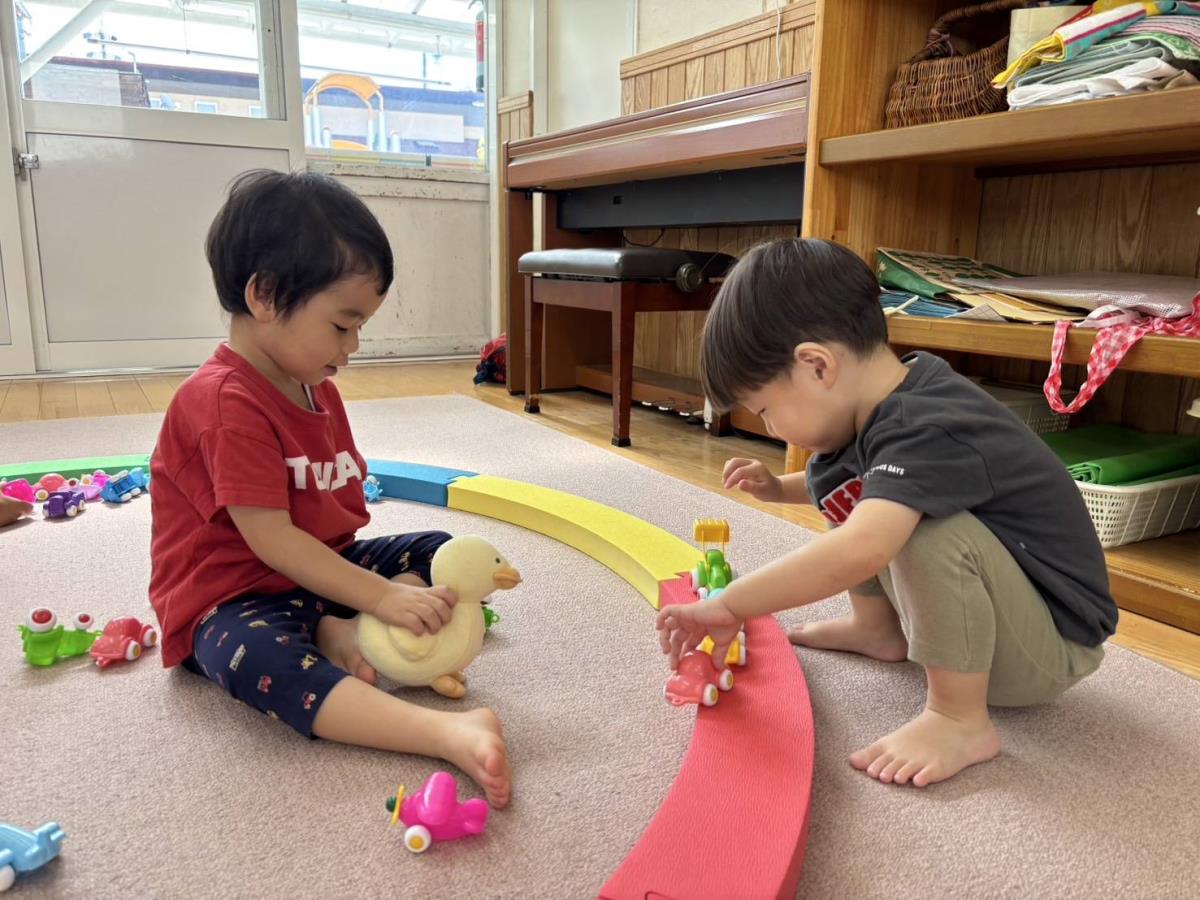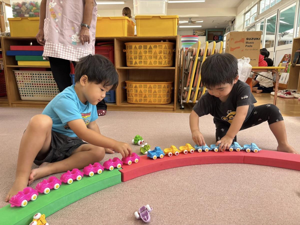 今日は午前中は少しだけ園庭で遊び、午後は車の玩具で遊びました。滑り台や砂場で遊ぶあか組さん。滑り台を登っている最中にアリがいることに気が付くと「アリいるよ!」「どこ行くのかな?」「公園行くのかな?」などの会話をお友達とする様子がとても微笑ましかったです。 |