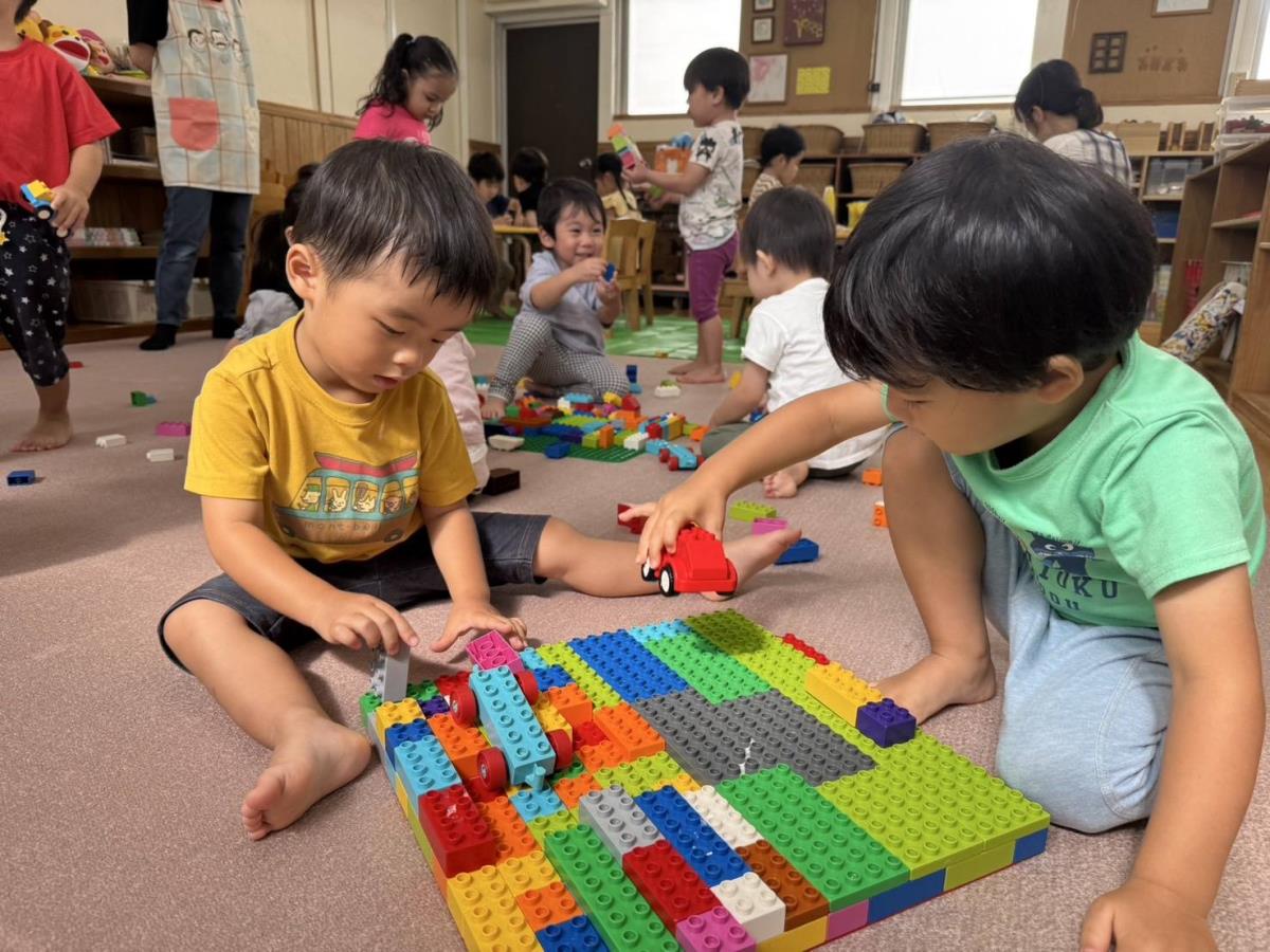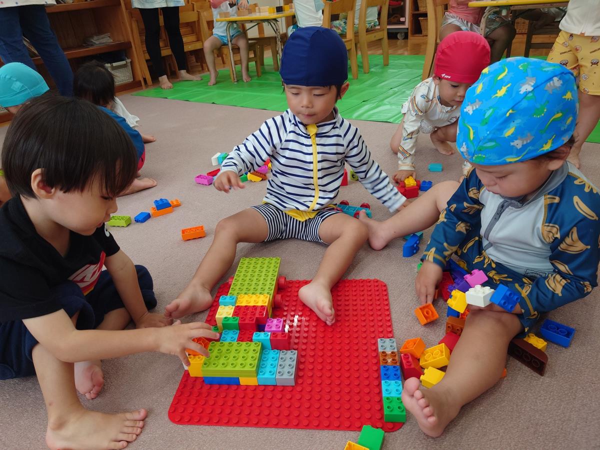 今日は室内でブロックや木製パズルで遊んだ後、小さいプールで遊びました。最近ブロック遊びでは、大きい板ブロックを出すとお友達と協力して一つの大きな家を作っている姿が多く見られるようになりました。「ここは車停めるとこだよ〜」など何を作ったのかも細かく教えてくれました。プール遊びでは、新しいプールを見て「スイカのプールだ〜!」と喜んでいました。