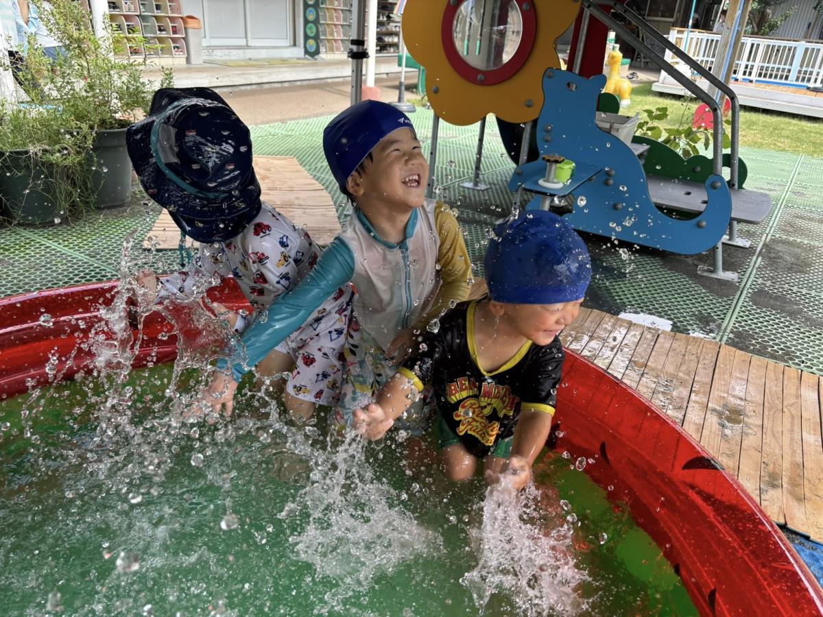 今日は、小さいプールでプール遊びをしました。「ばしゃーん!ばしゃーん!」と言いながらプールの中で恐竜になりきったり、保育士に向けてこっそり水鉄砲をやって笑ったりする姿が見られとても可愛らしかったです。 |