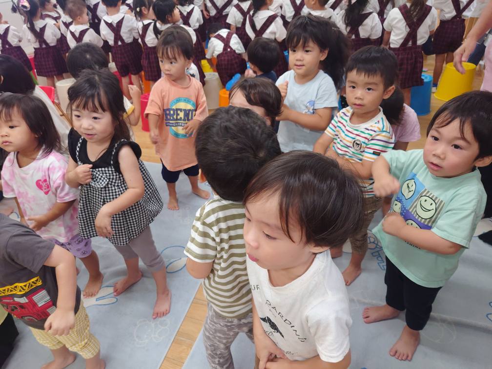 今日はきっずばんやブロックで遊んだ後に小さいプールで水遊びをしました。みんなで恐竜やオバケに変身して歩いてみたり、電車になったりと楽しく遊ぶ事ができました!水をお顔につけてみる事にも挑戦しました。頑張ってお顔をつけて見せてくれるお友達が多かったです♪