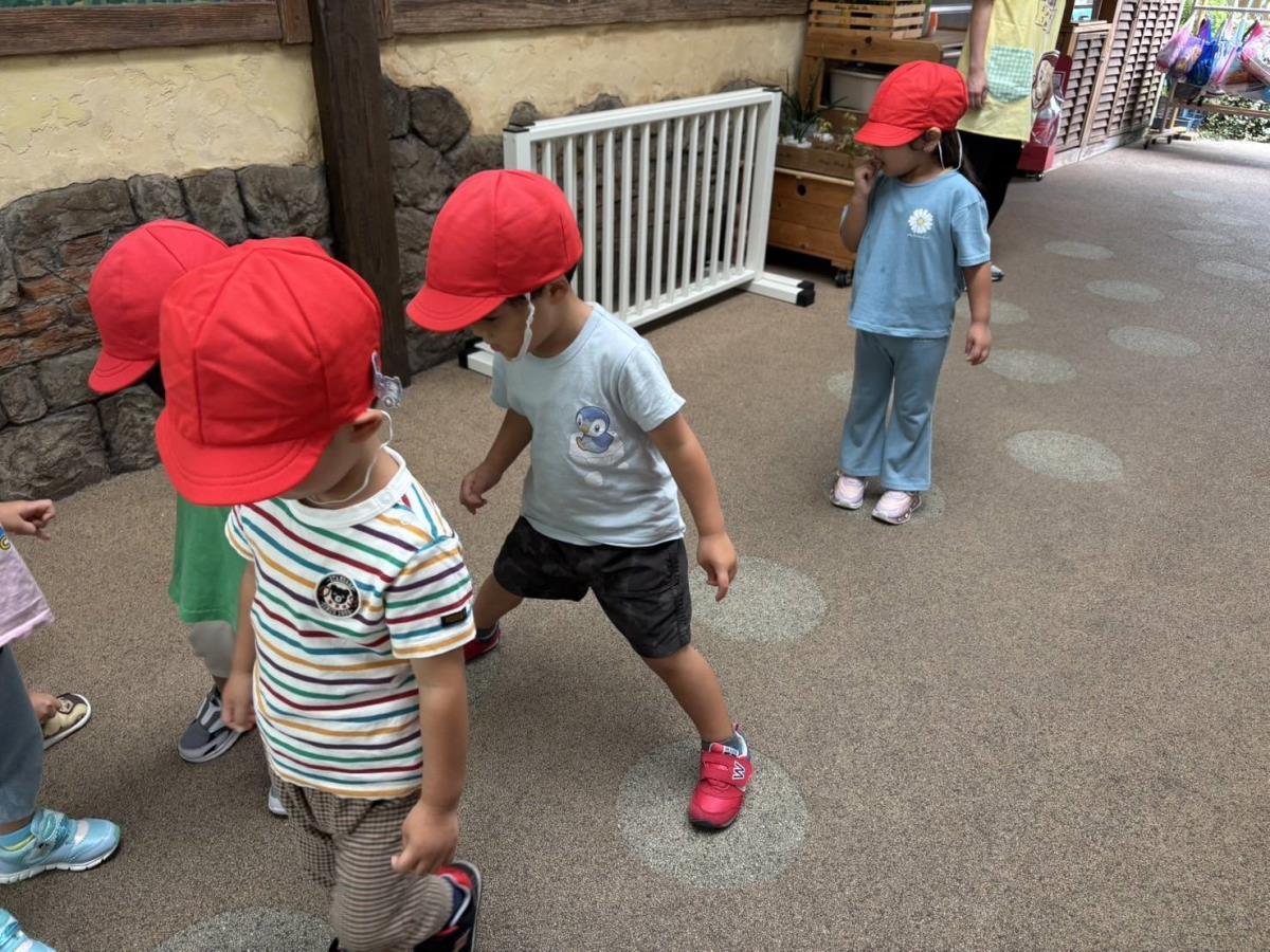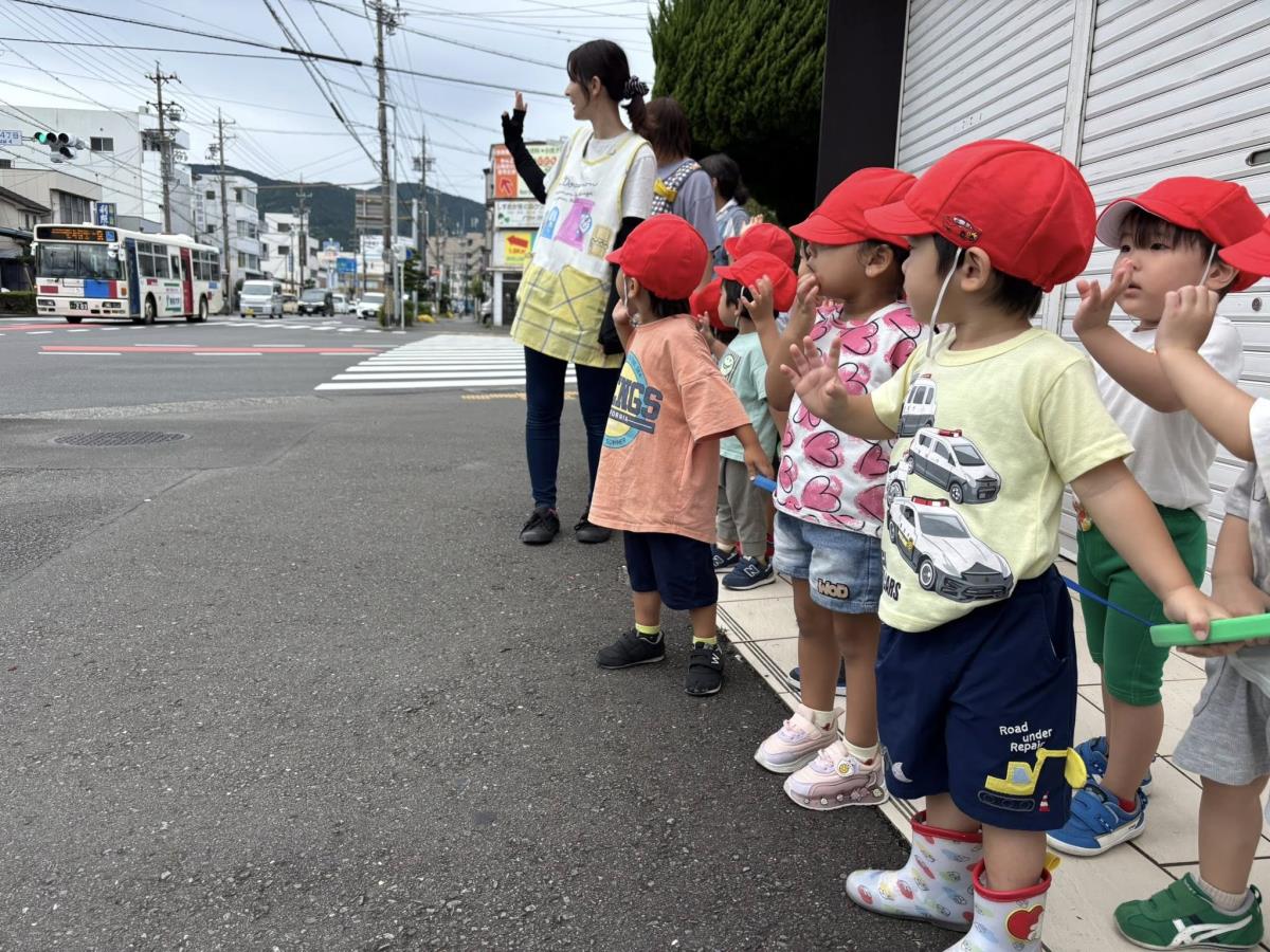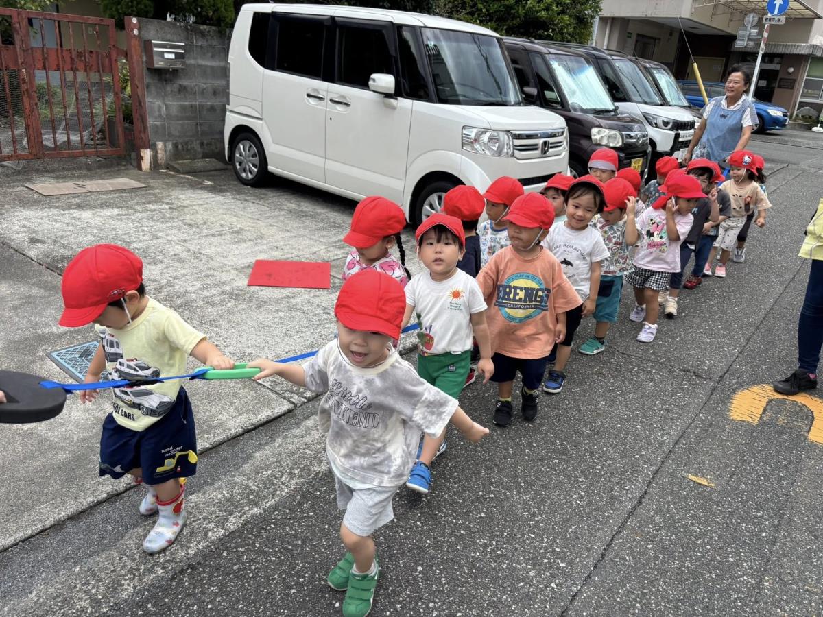 今日は園周辺をお散歩した後に園庭で遊びました。お散歩ではバスが3台見れたり、ゴミ収集車、ミキサー車を見れたり、犬に会ったり色々な発見が楽しいお散歩になりました。誘導ロープで歩く事も慣れてきて上手に歩いています!