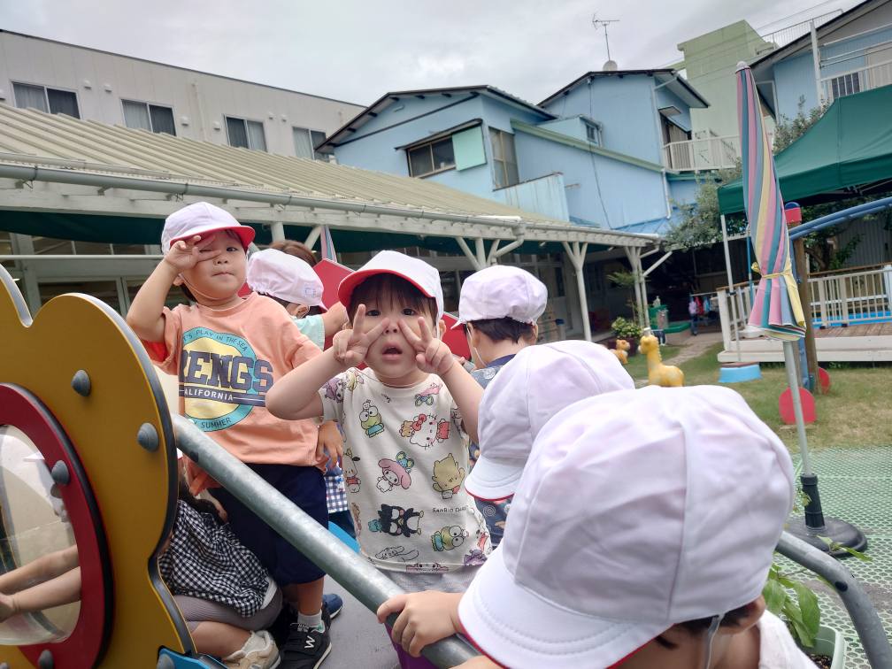 今日は園庭で遊びました。フラフープを並べてぴょんぴょんと飛び跳ねて進んでいくことを楽しむ子たちや、石の滑り台に一生懸命登り「先生見てー!」「登れたよー!」と喜ぶ姿などが見られました。暑い1日ではありましたが、元気いっぱいのあか組さんでした。