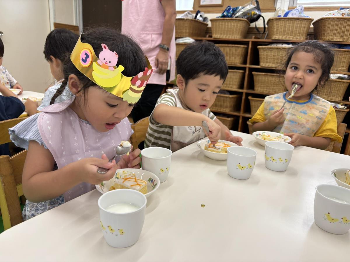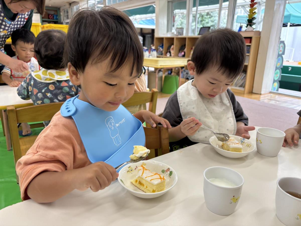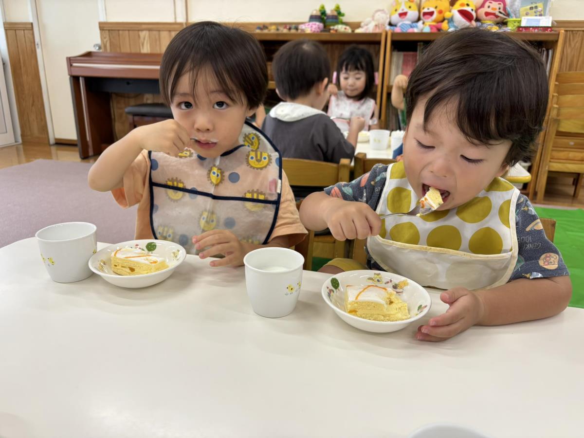 今日はお誕生会に参加しました。あか組さんのお誕生日のお友だちは2人で前に出てしっかりインタビューに答える事ができました!他のお友だちも拍手をしてお祝いをしてくれたり、保育士からのプレゼントの保育士劇『さんまいのおふだ』を見たりして楽しんでいました♪おやつはみんなが楽しみにしていたケーキ!今月はキャラメルのケーキでした。「おいしい」と言いながら食べていました♪