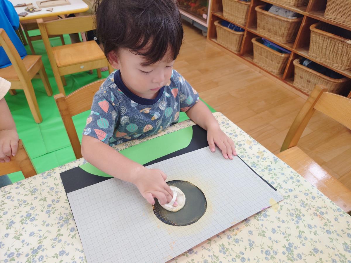 今日は、制作やパッチンブロック、木製の車で遊びました。制作ではパステルで月を描きました。保育士の話をしっかり聞き、集中したお顔で取り組んでいました。終わったあとは「これ楽しかった〜」と言っている子もいました。 |