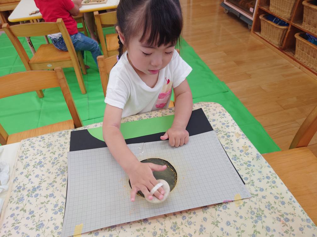 今日は気温が高かったため、室内で制作やBブロック、木のパズルなどで遊びました。制作では、アルミホイルをスタンプにして砂浜を表現しました。最初は探り探りやっていたあか組さんてしたが、慣れてくると豪快にポンポンスタンプをしていました。 |