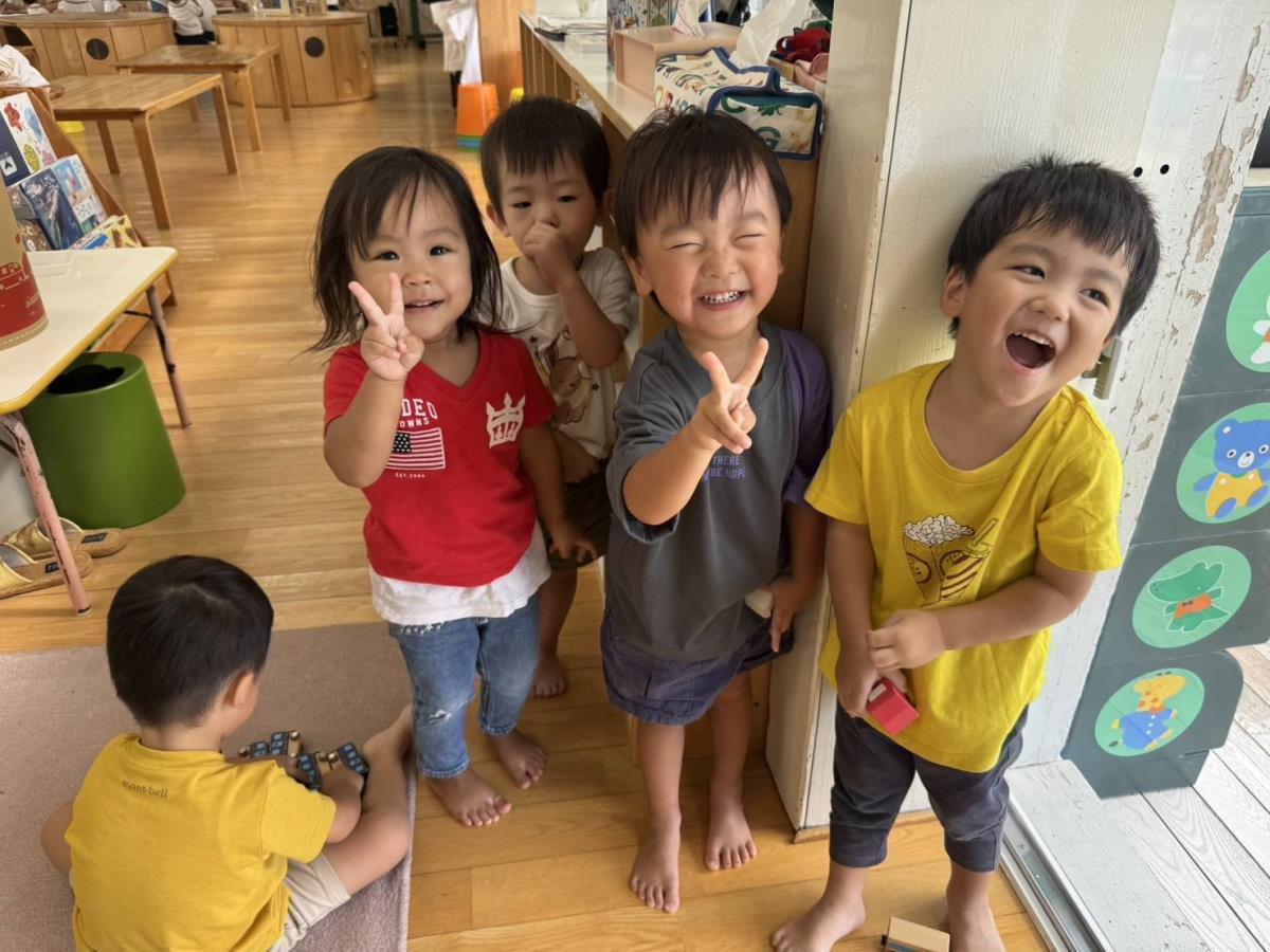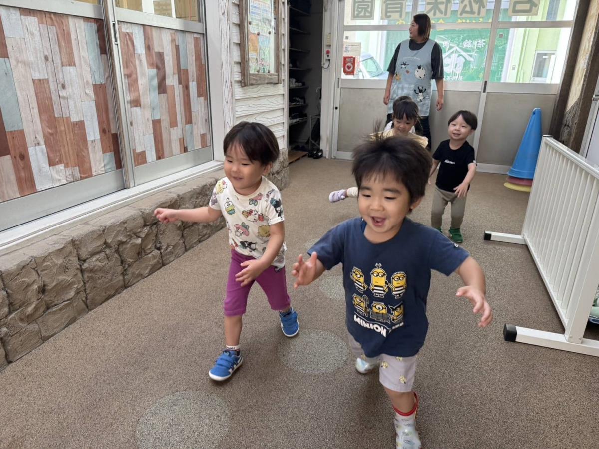 朝、登園しお部屋に入ると、「〇〇に行ったよ〜!」などお休みの時のお話をしてくれる子もいました。今日は園庭で遊びました。久しぶりの保育園に大はしゃぎなあか組さん。お友達の名前を呼んで、一緒に三輪車や砂場遊びを楽しんでいました。