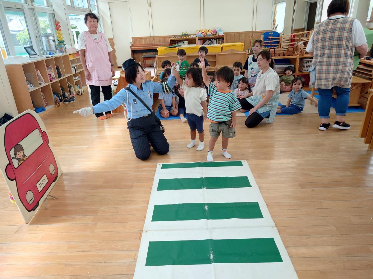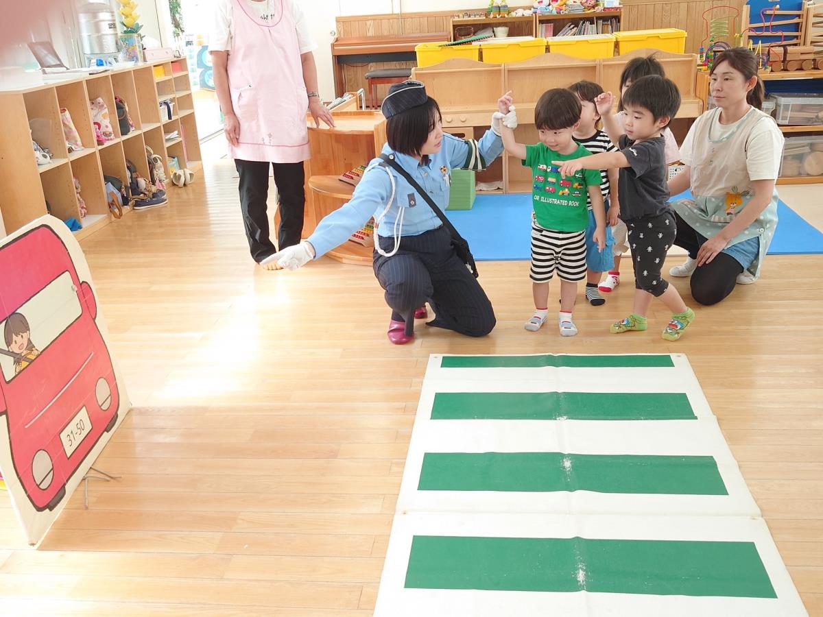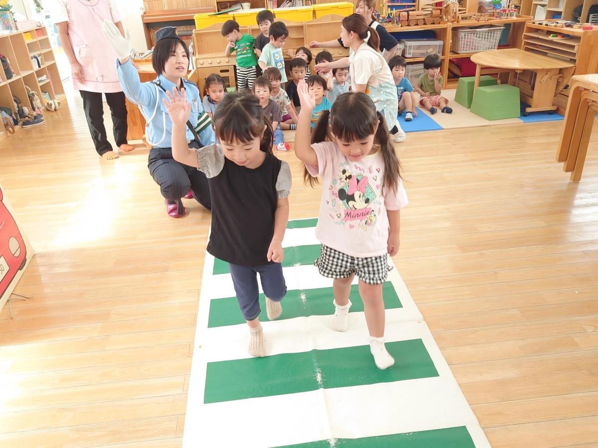 今日は交通安全教室がありました。指導員さんのお話を真剣に聞くあか組さん。道路を歩く際のお約束などを聞いたあとはお部屋の中に横断歩道を作り、実際に練習をしました。手を挙げ、左右を確認して上手に渡ることができました。午後はプール納めの会に参加しました。 |