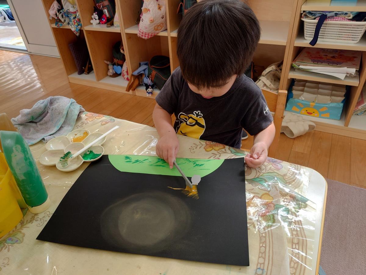 今日は粘土遊びをしながら順番に昨日の制作の続きをやりました。制作では歯ブラシに緑、黄緑の絵の具をつけて草を表現しました。トントンと歯ブラシを上手に動かして楽しみながら制作ができました♪午後のおやつ後はきっずばんの絵合わせカードをやってみました。何の絵ができるか考えながら頑張ってカードを繋げていました!